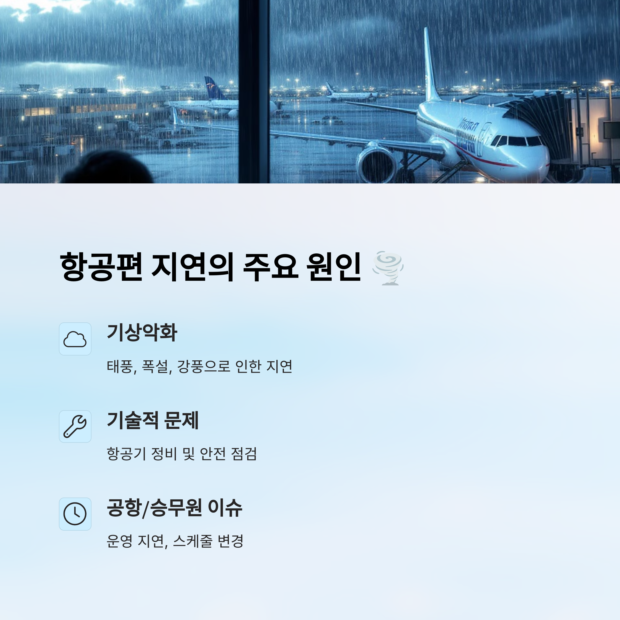 | 정비 지연 | 항공기 이상 발견 시 수리 필요 |