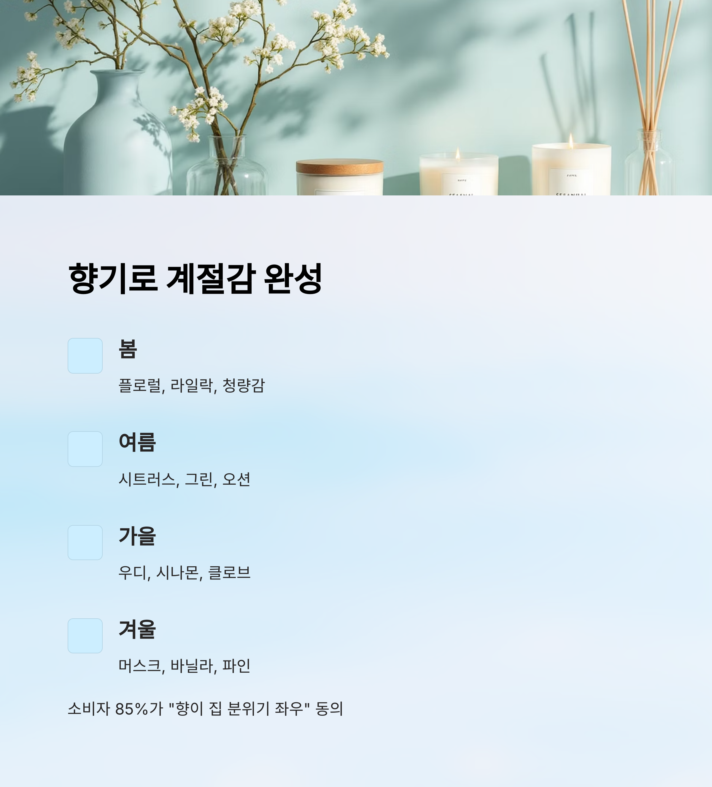 봄엔 플로럴 계열, 여름엔 민트나 시트러스, 가을엔 우디와 머스크, 겨울엔 바닐라와 앰버향이 잘 어울려요. 디퓨저, 캔들, 룸 스프레이 모두 활용 가능해요.