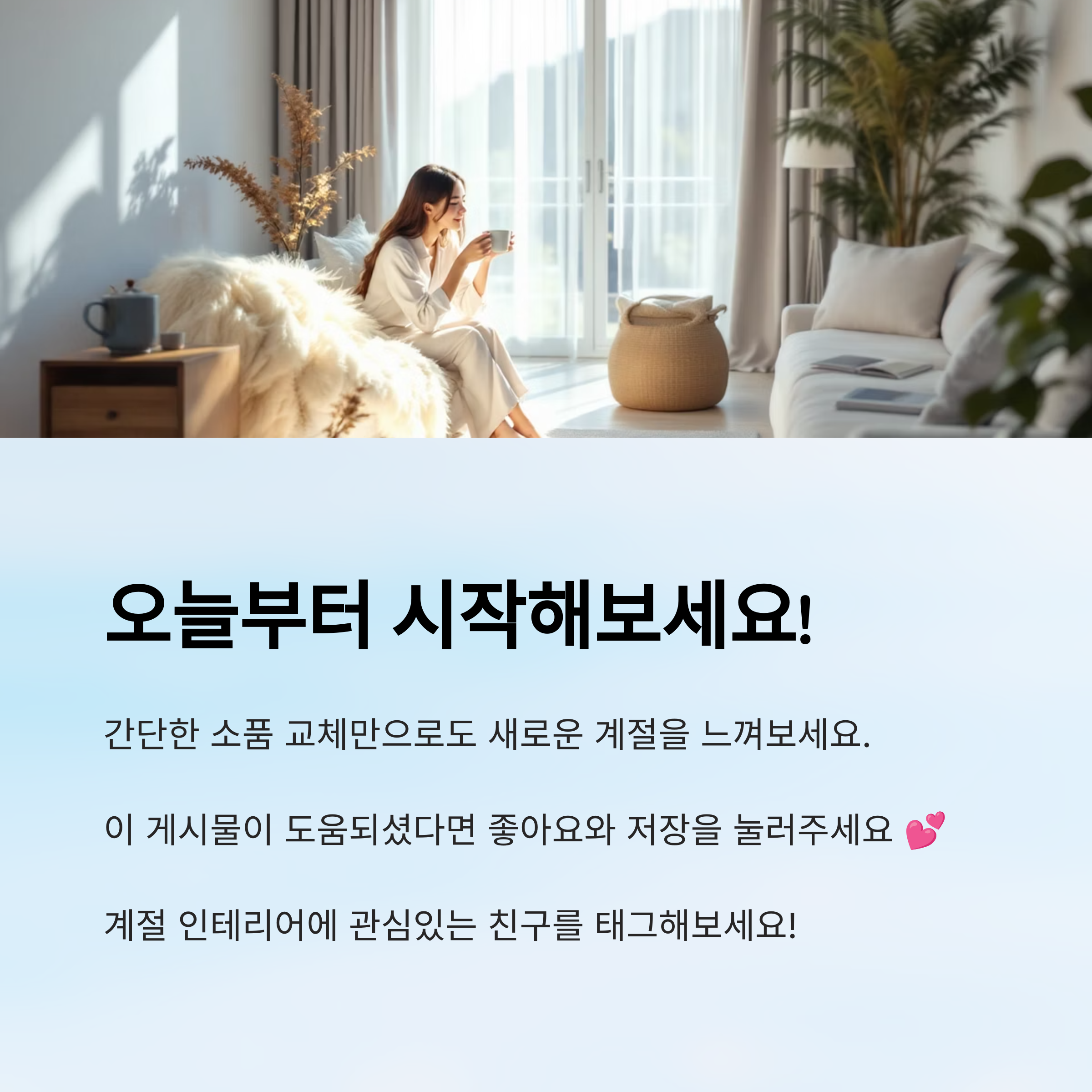 하지만 새로 가구를 사거나 전체 인테리어를 바꾸는 건 비용도 크고 번거롭기 마련이에요. 이럴 때 필요한 게 바로 ‘미니멀 계절 인테리어’예요!