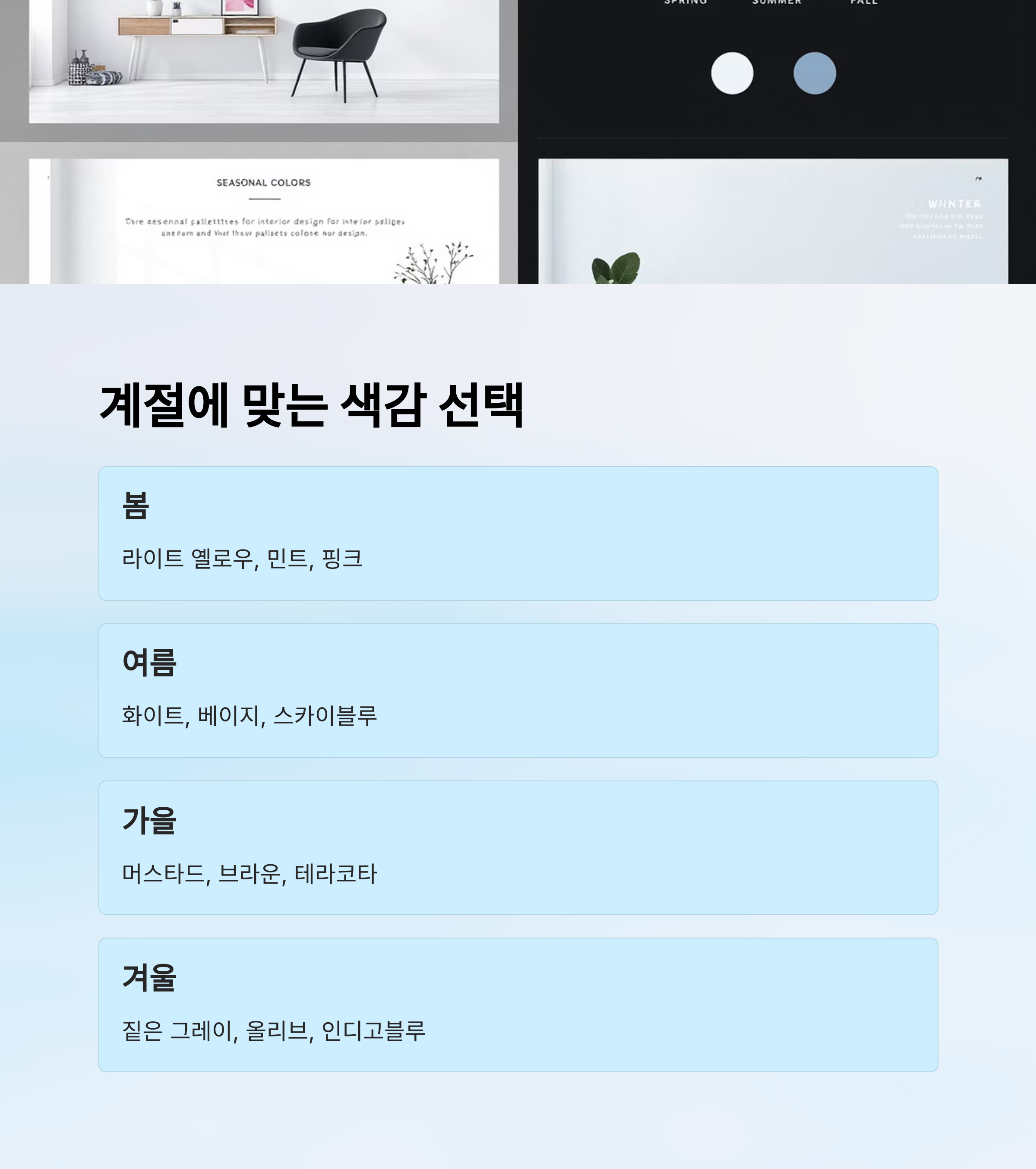 봄엔 라이트 옐로우, 파스텔핑크, 연두색처럼 생기 있는 톤이 좋아요. 여름에는 화이트, 라이트블루, 시원한 민트 컬러로 청량한 분위기를 만들 수 있어요.