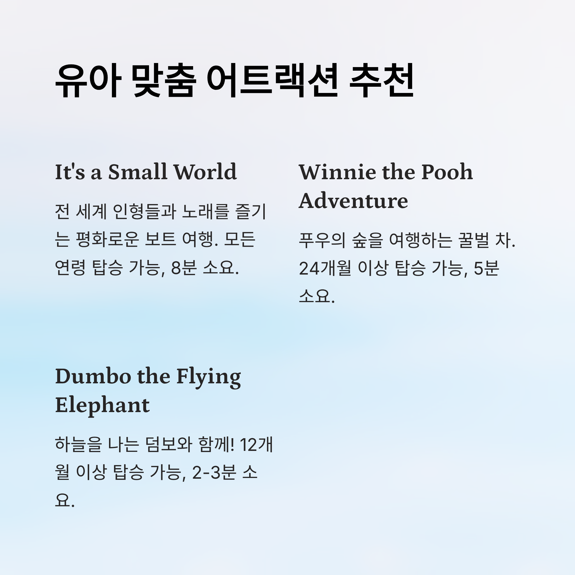 | Dumbo the Flying Elephant | 12개월 이상 | 판타지랜드 | 2~3분 |