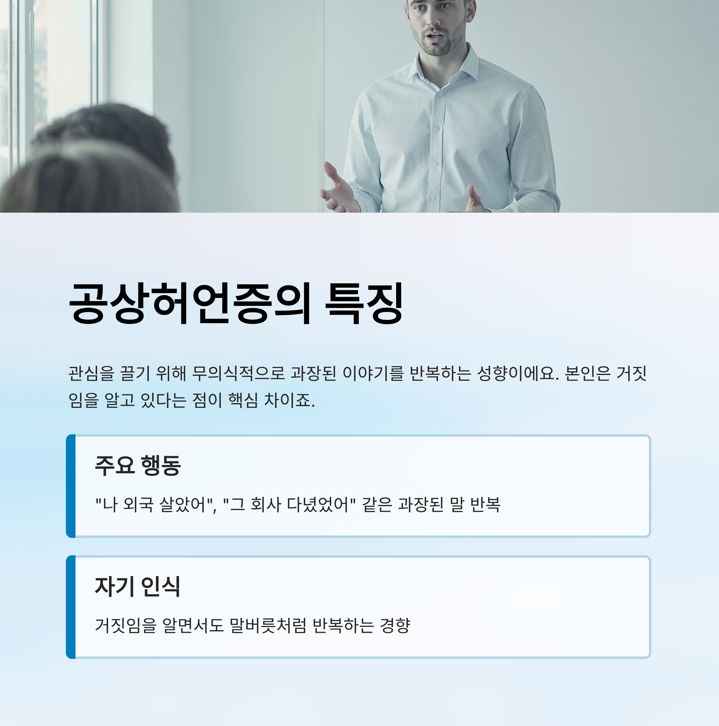 반면 공상허언증(또는 병적 거짓말, 허언증)은 주로 관심을 끌기 위해 무의식적으로 거짓말을 반복하는 성향이에요. “나 어릴 때 외국 살았어”, “내가 원래 그 회사 다녔었어” 같은 말들이 반복적으로 나오는 경우죠. 본인은 이 말이 사실이 아니란 걸 알고 있는 경우가 많아요.