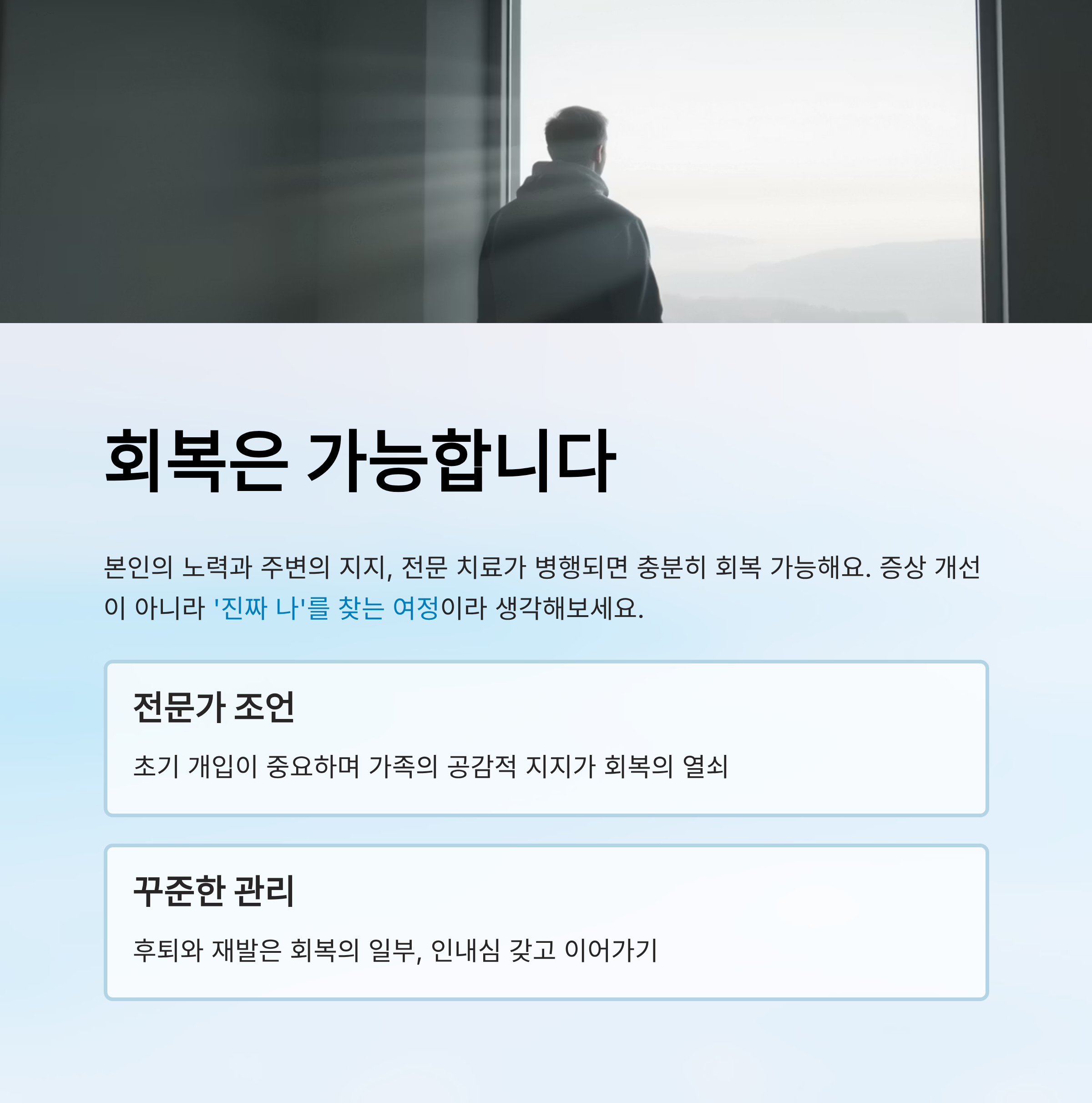 | 공통 권장사항 | 전문상담과 심리치료를 병행하고, 가족의 지지와 격려가 반드시 동반되어야 함 |