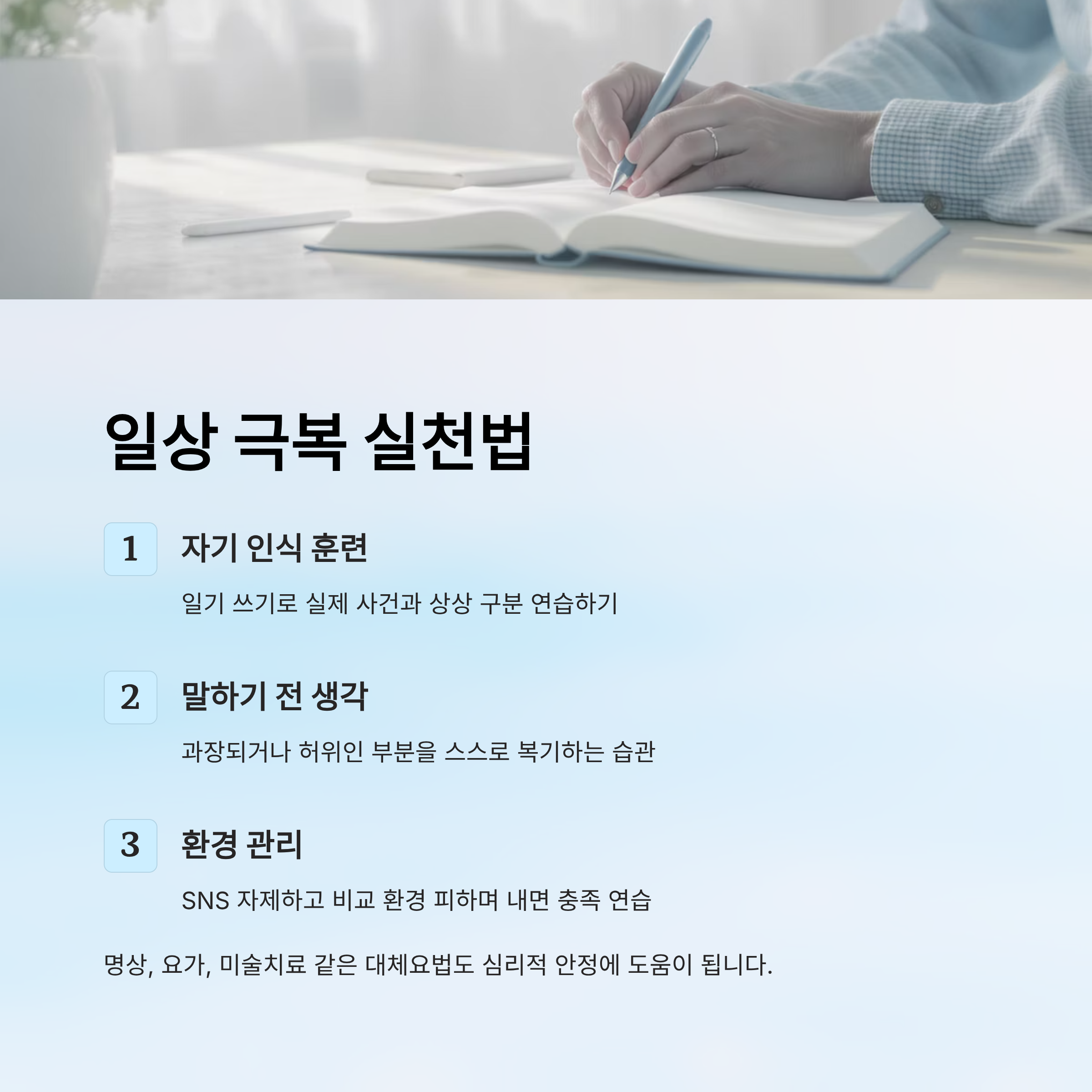 공상허언증은 상황이 비교적 덜 심각할 수 있지만, 반복되면 인간관계에서 신뢰를 잃기 쉬워요. 그렇기 때문에 스스로 말한 내용을 되돌아보고, 과장되거나 허위였던 부분을 솔직하게 정리하는 습관이 도움이 돼요. 이 연습은 자신을 객관화하는 능력을 키워주죠.