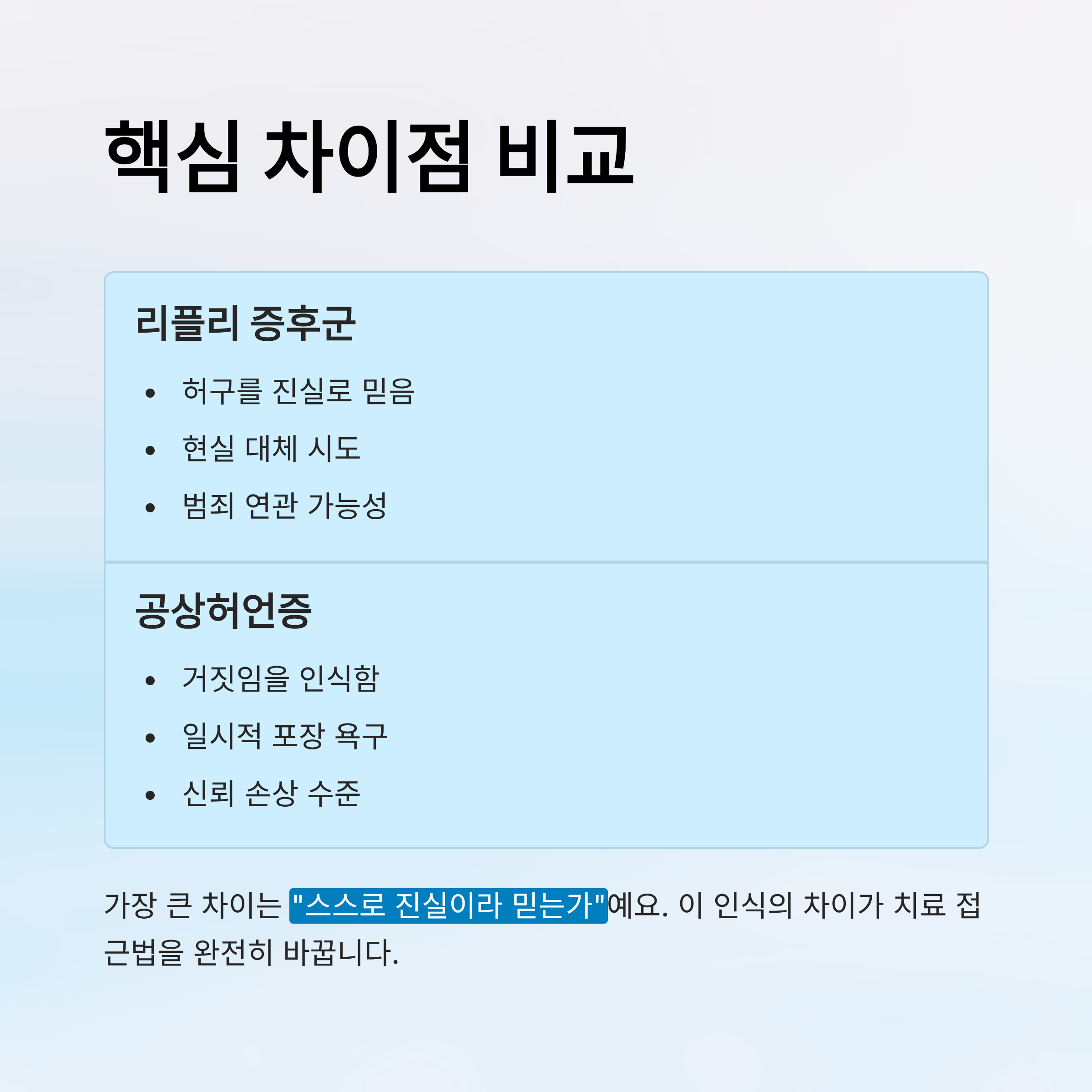 이 두 가지는 모두 ‘거짓말’이라는 공통점을 공유하지만, 리플리 증후군은 허구를 진실로 믿고 행동까지 옮기며, 공상허언증은 거짓임을 알면서도 반복된 말버릇처럼 나타난다는 점에서 본질이 다르다고 할 수 있어요.