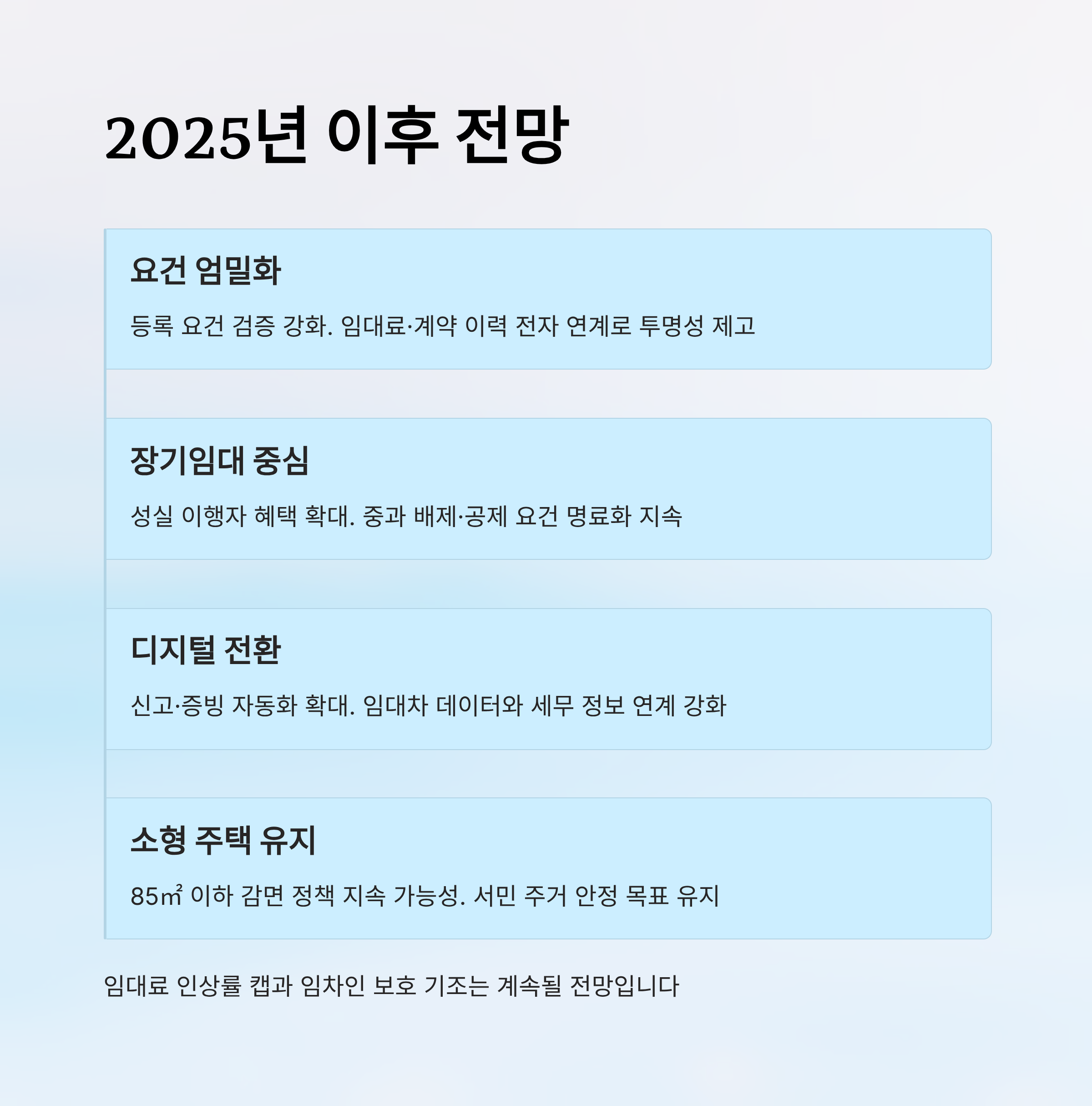 2025년 시점에서 주택임대사업자 세제는 임차인 보호와 장기임대 유도라는 두 축이 계속 유지될 가능성이 커요. 임대차 시장의 안정성을 높이기 위해 장기 보유자에게 인센티브를 더 정교하게 설계하는 흐름이 관찰돼요. 등록 임대의 요건 충족 여부를 세밀하게 확인하는 절차가 강화되고, 임대료 관리 기준을 명확히 고지하는 방식이 널리 도입될 공산이 높아요.