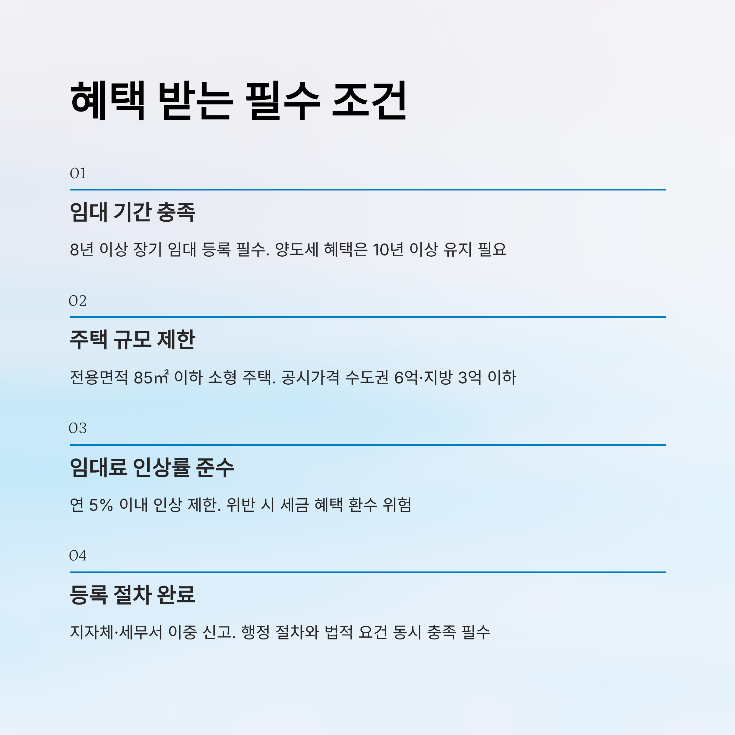 A1. 등록 자체가 전제이긴 하지만 면적, 공시가격, 임대 기간, 임대료 인상률 같은 요건을 동시에 충족해야 해요. 조건 미이행 시 배제 대상에서 빠질 수 있어요.