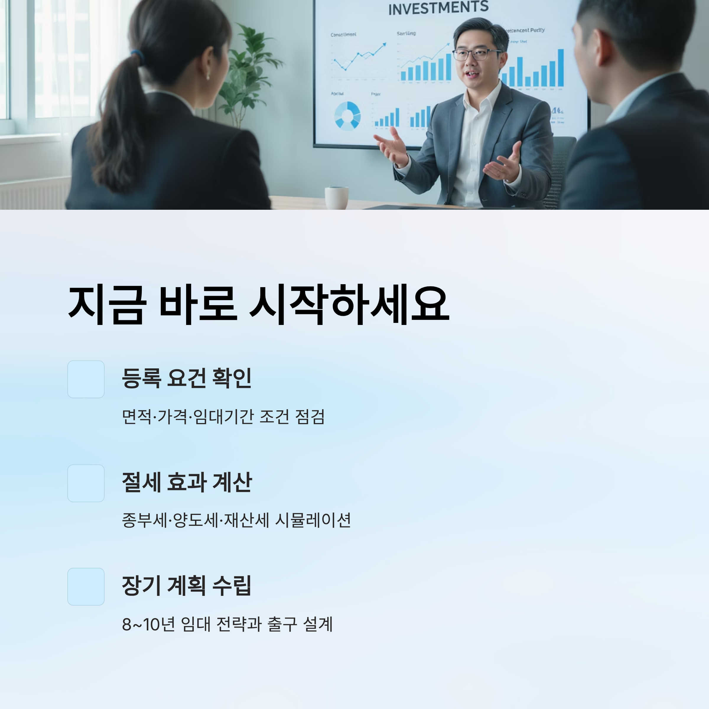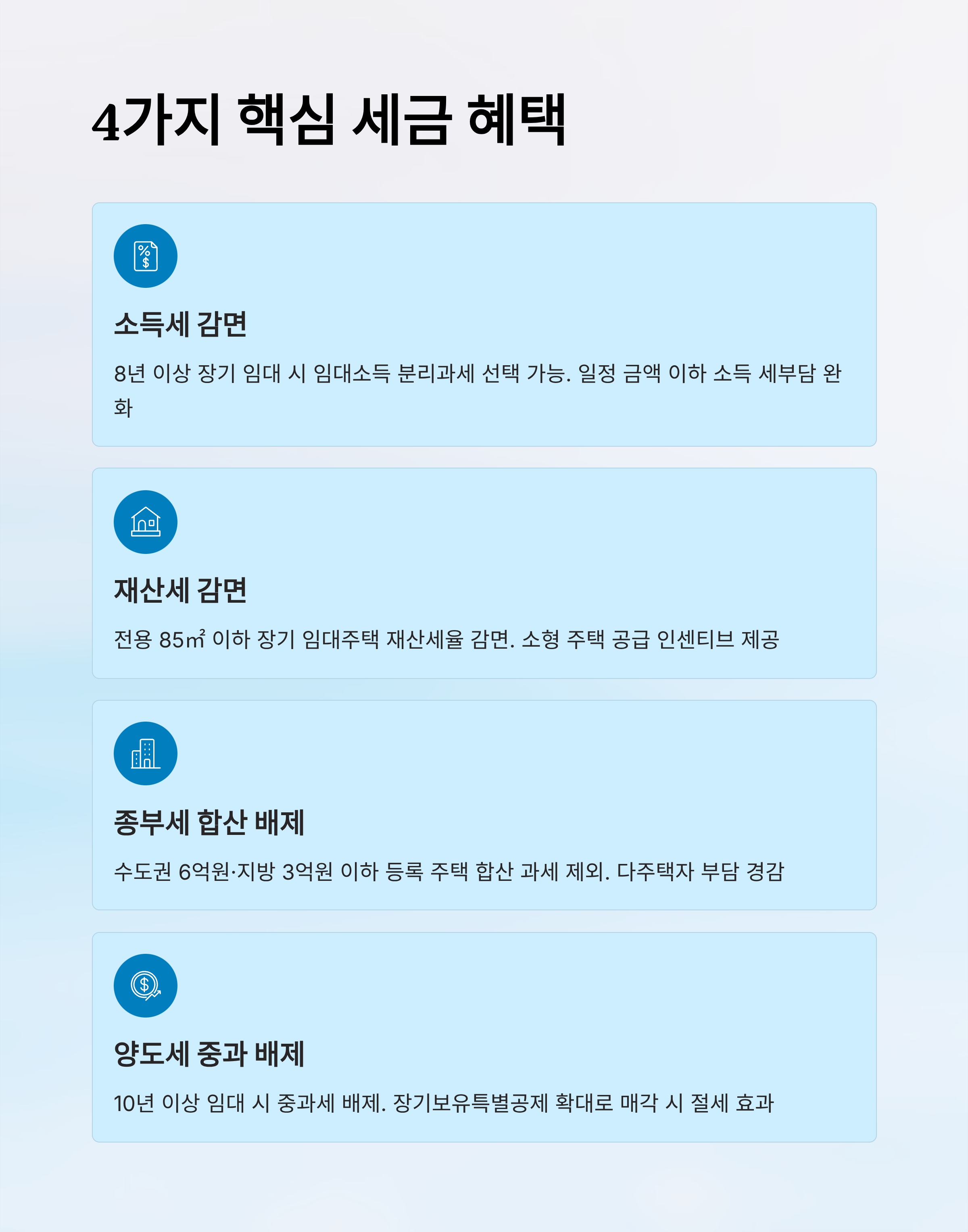 | 양도세 절세 | 10년 이상 장기 임대 | 중과 배제, 장특공 확대 |