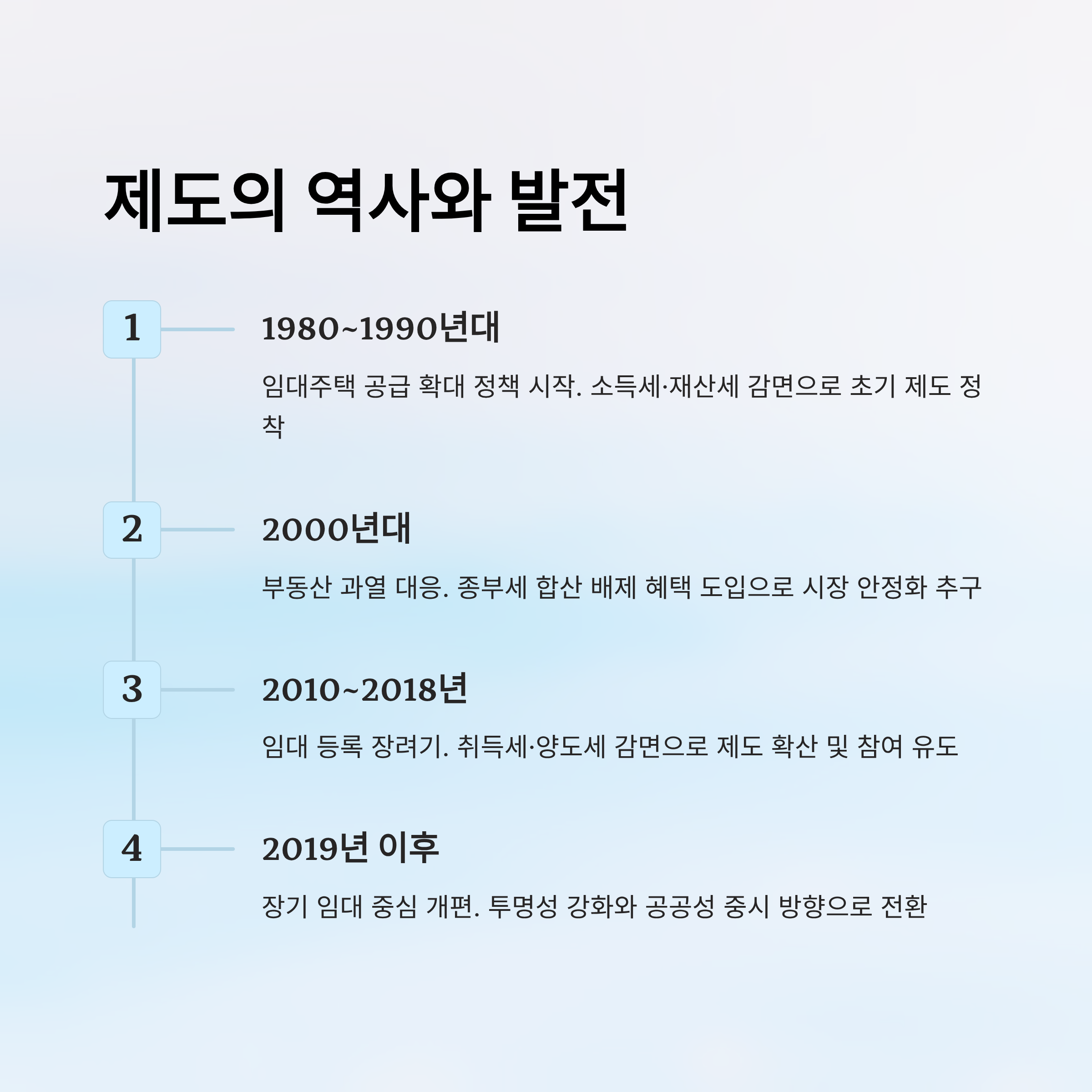 | 1980~1990년대 | 임대주택 공급 확대 | 소득세·재산세 감면 | 초기 제도 정착기 |