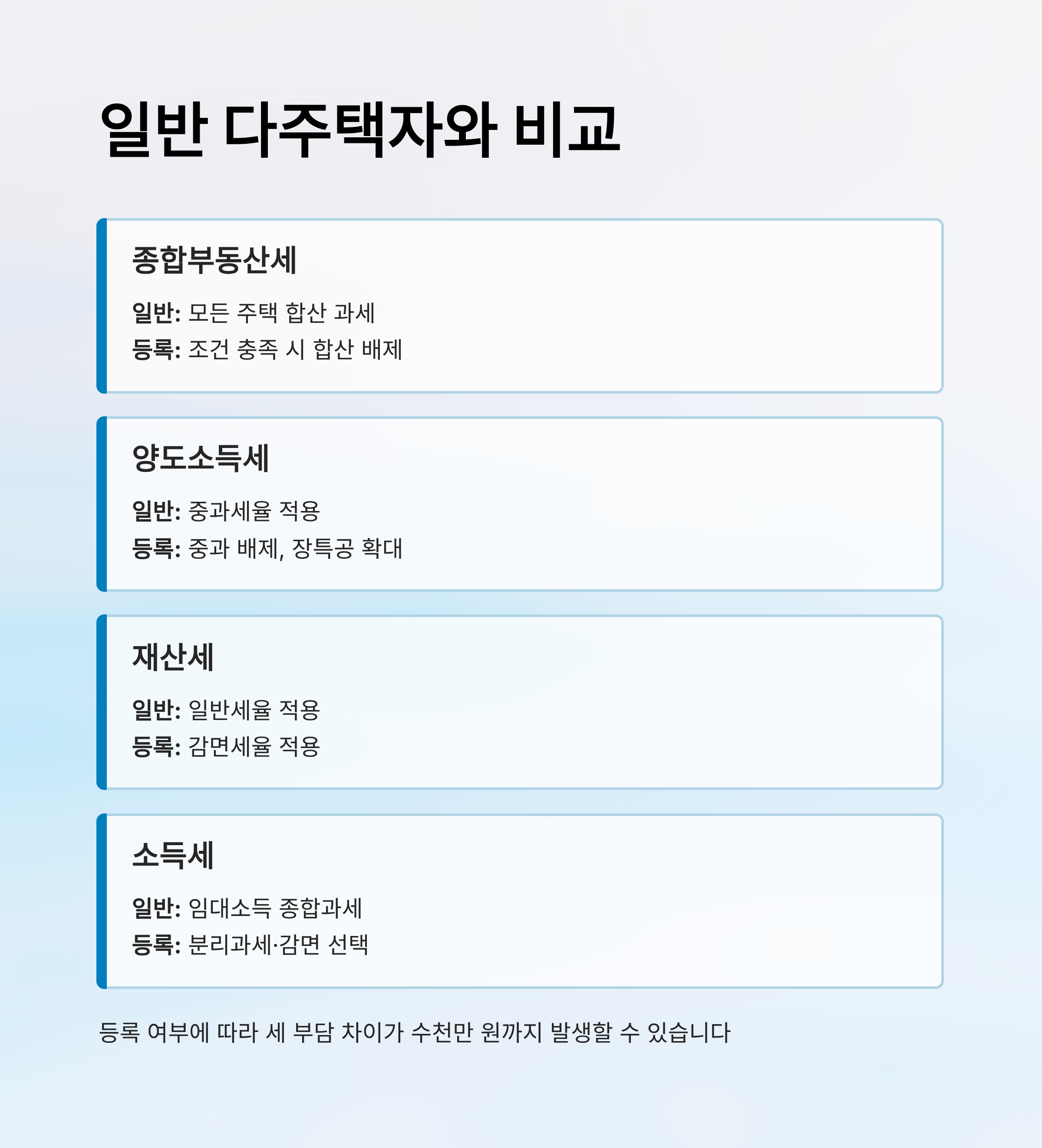 주택임대사업자의 세금 혜택을 제대로 이해하려면 일반 다주택자에게 적용되는 세제와 비교해 보는 게 가장 효과적이에요. 세제는 같은 주택이라도 등록 여부에 따라 세 부담 차이가 크게 달라질 수 있기 때문에, 투자자 입장에서는 이 차이를 계산해 보는 게 필수적이에요.