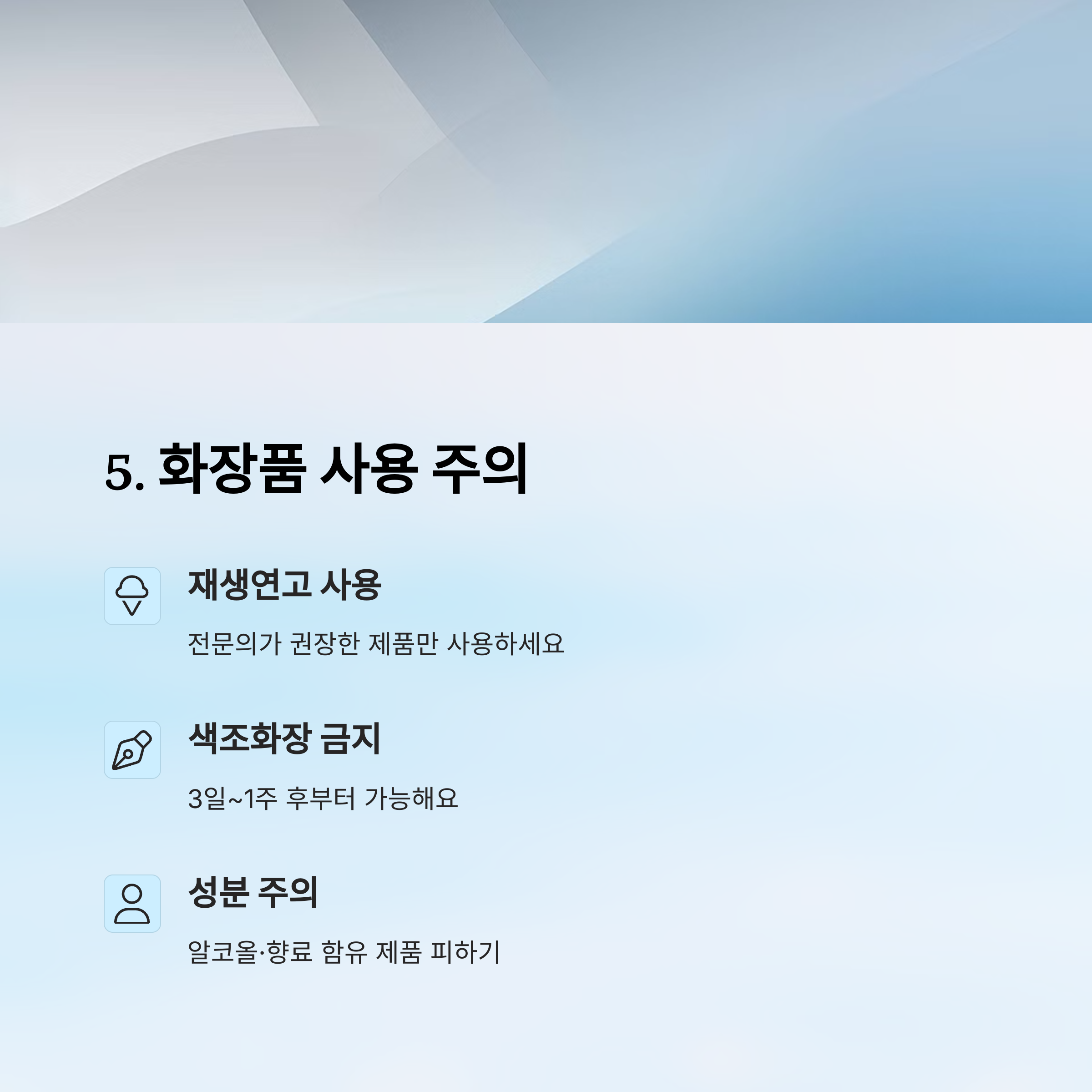 시술 직후엔 메이크업은 물론이고, 기능성 화장품도 잠시 쉬는 게 좋아요. 특히 비타민C, AHA, 레티놀 같은 자극적인 성분은 며칠간 피해주세요.