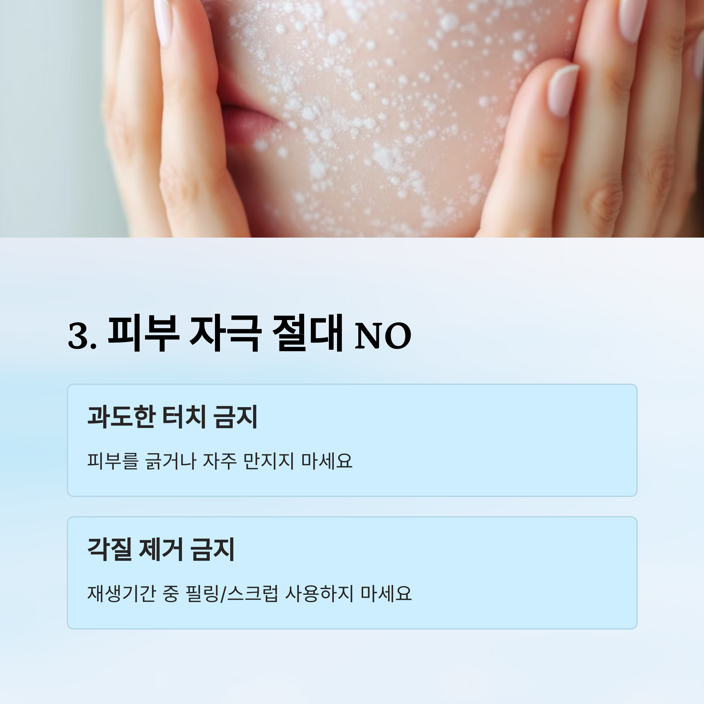 각질제거, 필링 패드, 롤링 마사지기 같은 도구는 당분간 금지! 시술 부위에 자극을 주면 상처나 색소침착이 생길 수 있어요.