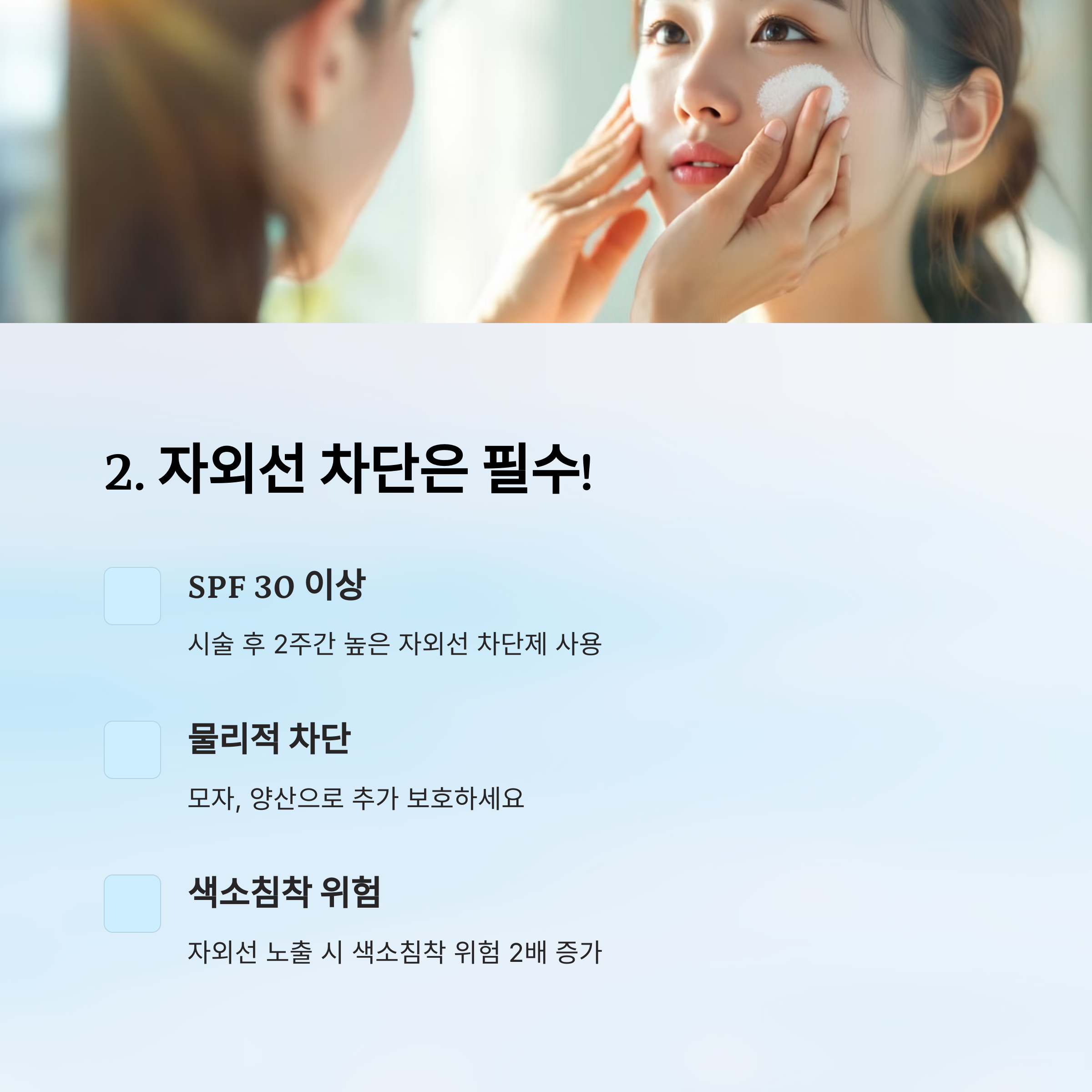 시술 후 피부는 외부 자극에 약해진 상태라서 자외선이 치명적일 수 있어요. 멜라닌이 올라오면서 색소침착이나 기미가 생길 수도 있어요.