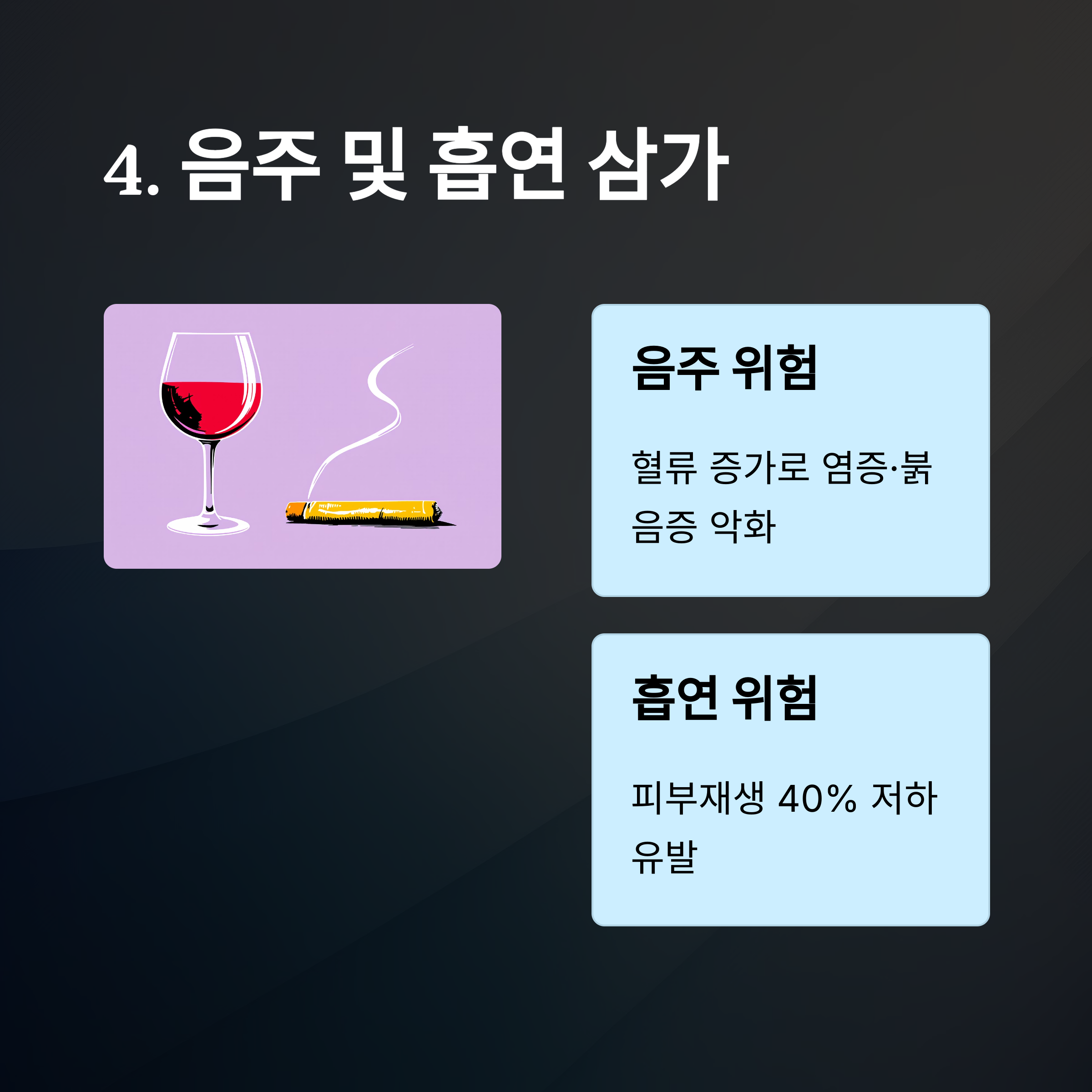 술과 담배는 회복을 느리게 만들고, 피부 재생력을 떨어뜨려요. 특히 음주는 시술 부위의 붓기와 열감을 더 심하게 만들 수 있어요.