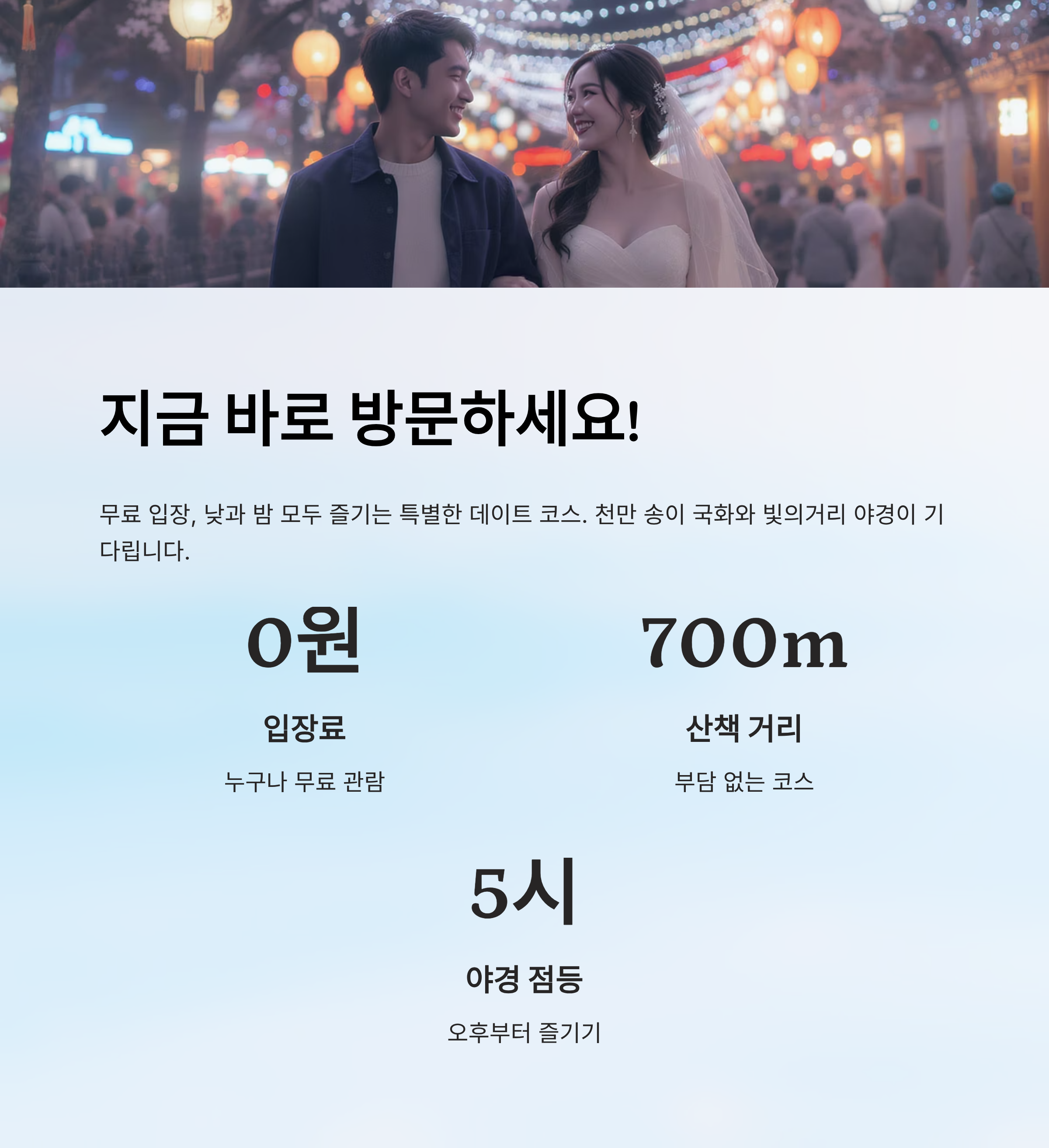 축제 정보를 몰라도 쉽게 따라 할 수 있는 추천 동선을 안내하니, 연인과 함께 걷는 길에서 놓치는 장면 없이 모두 즐길 수 있어요.