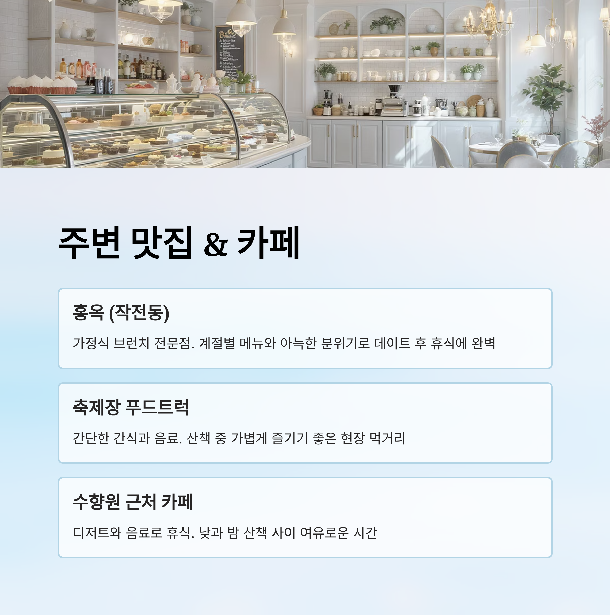 이제 이어서 주변 맛집과 카페 추천 정보를 안내할게요. 빛의거리 데이트를 즐기며 식사나 휴식을 계획할 때 참고하면 좋아요.