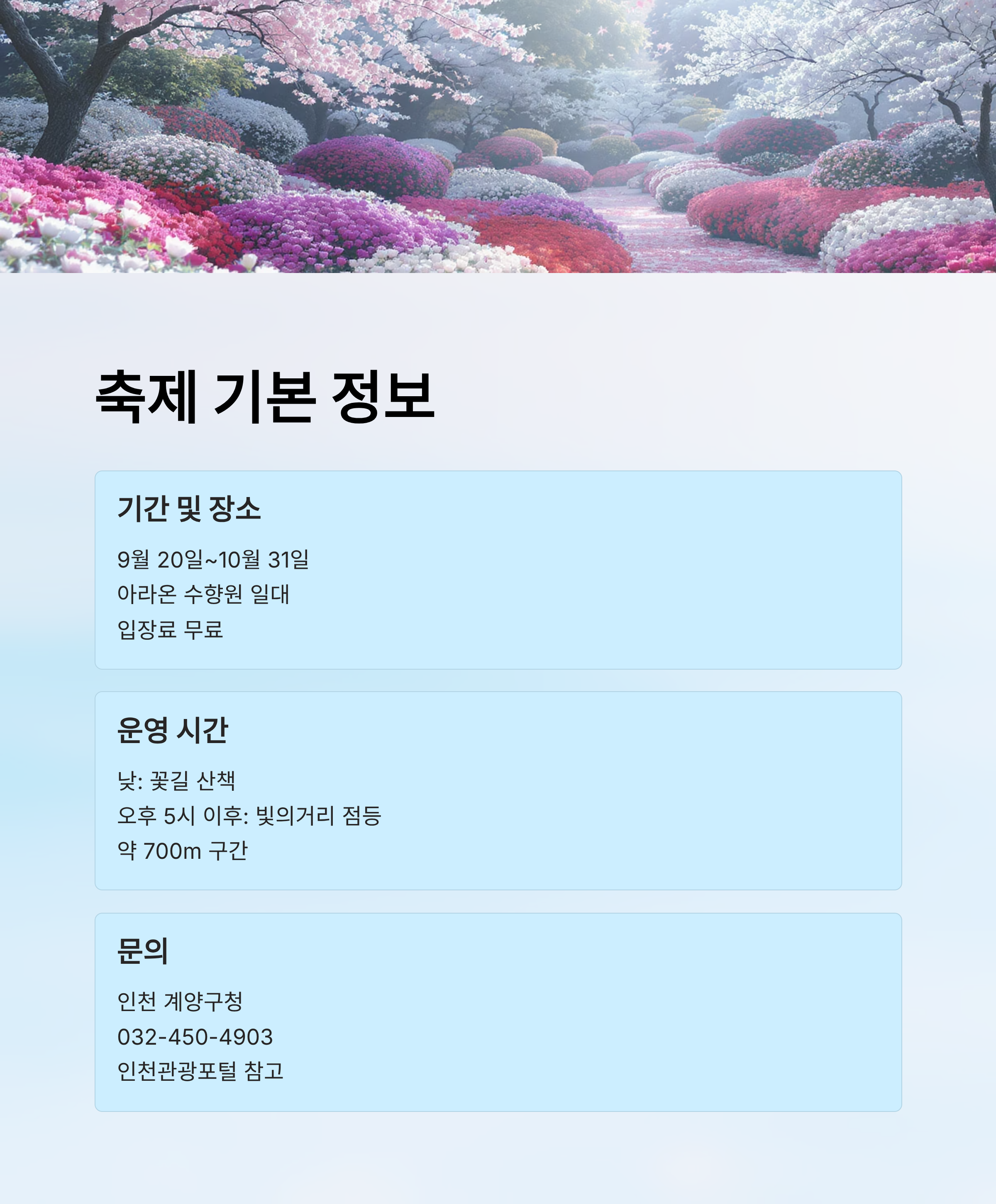 주최는 인천 계양구청이며, 문의는 032-450-4903로 가능해요. 축제 전반에 걸친 상세 안내는 공식 인천관광포털을 참고하면 좋아요.