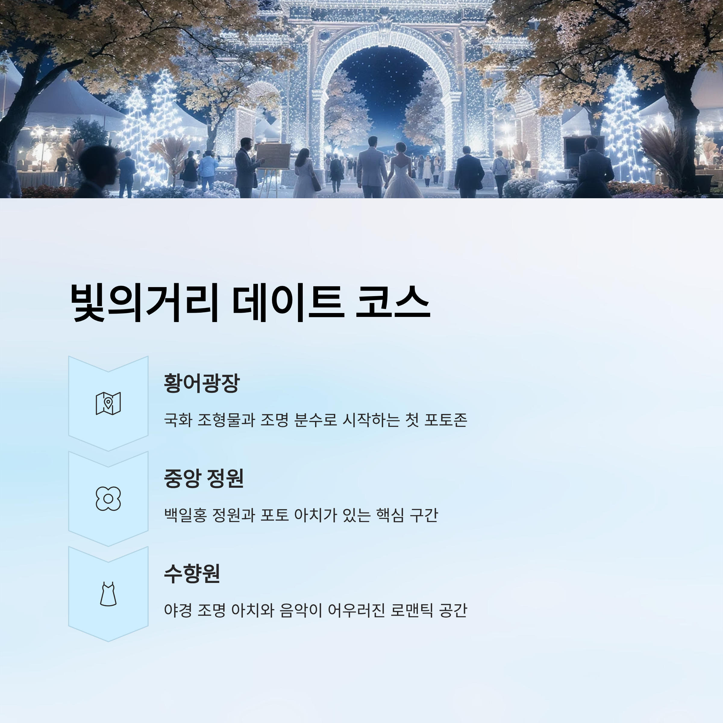 앞으로 이어지는 섹션에서는 빛의거리 중심의 데이트 코스, 사진 촬영 팁, 맛집 추천, 접근성 정보를 순차적으로 안내할게요. 글이 길지만 따라오면 쉽게 이해할 수 있어요.