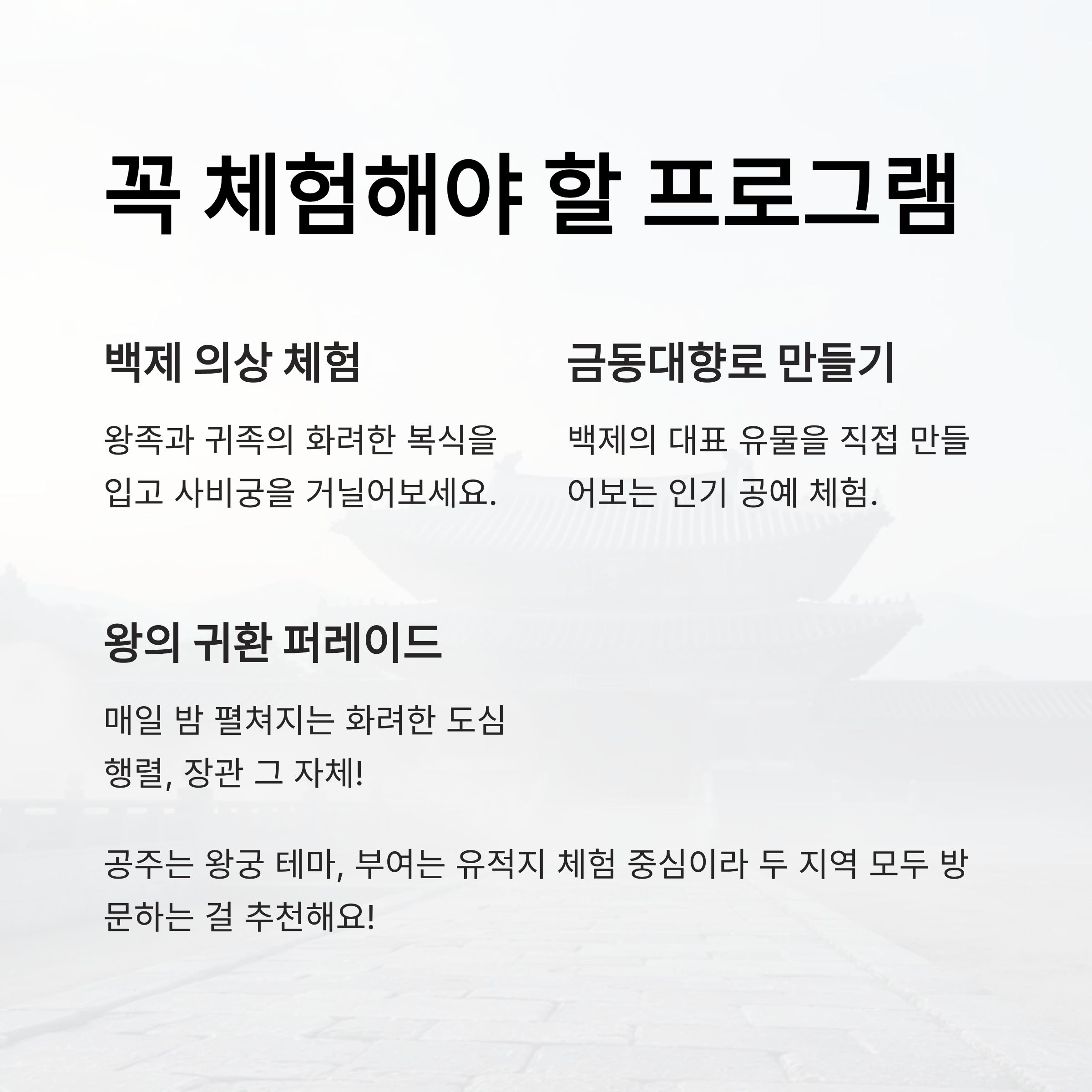 공주와 부여 양쪽에서 열리는 프로그램이 조금씩 다르기 때문에 두 지역 모두 방문하는 것을 추천해요. 공주에서는 왕궁 테마 체험이 중심이고, 부여는 유적지와 전통생활 체험이 중심이거든요. 하루는 공주, 하루는 부여 코스로 짜면 딱이에요!