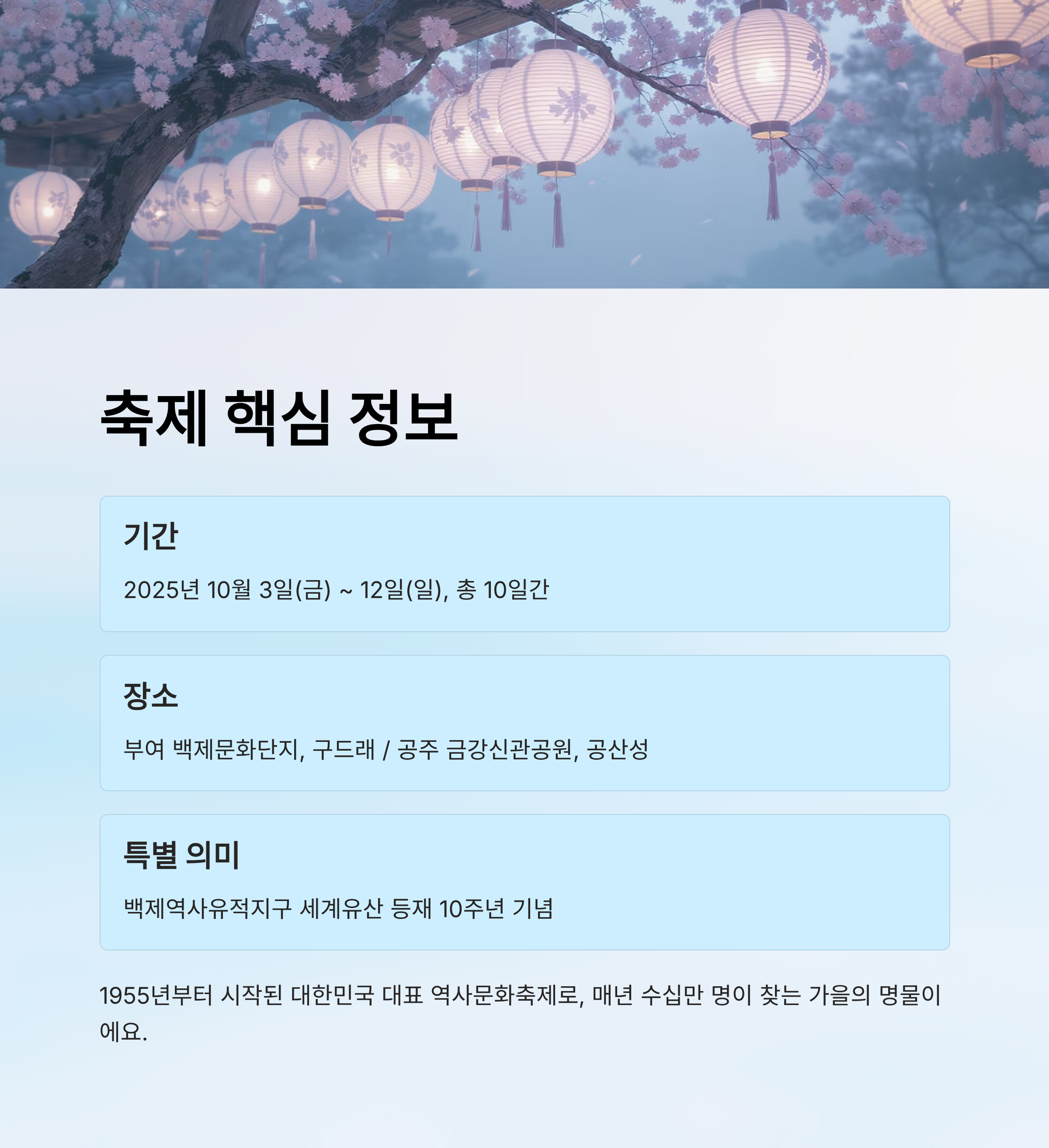 축제는 2025년 10월 3일(금)부터 10월 12일(일)까지 딱 10일간 열리며, 역사 속 백제를 테마로 한 퍼레이드, 제례, 공연, 체험이 가득 펼쳐진답니다. 개최 장소는 백제의 수도였던 부여와 공주 두 도시로 나뉘어 열리고 있어요.