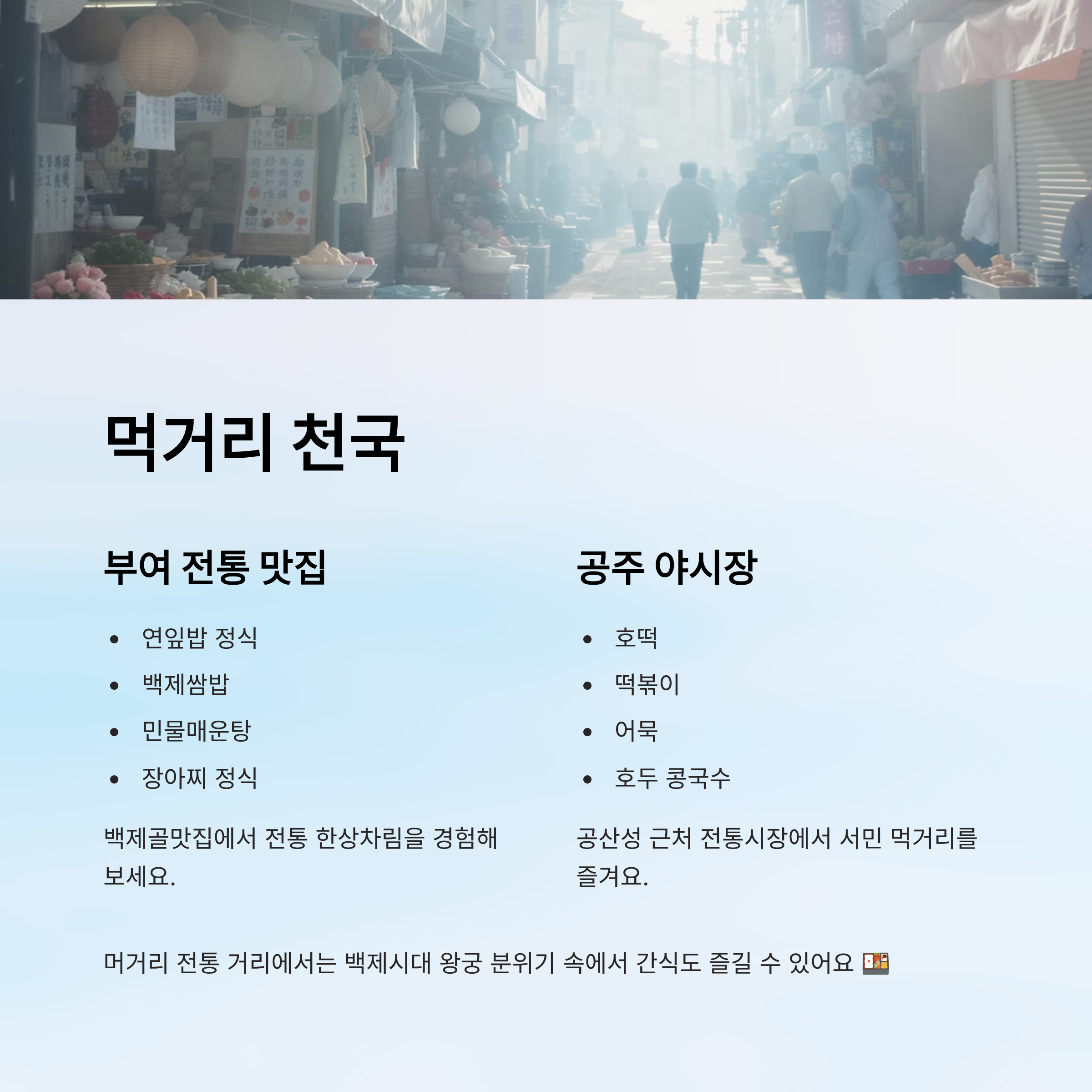 공주 쪽에는 공산성 근처에 있는 전통시장이나 야시장에서 호떡, 떡볶이, 백제쌈밥 같은 서민 먹거리들이 인기를 끌고 있어요. 특히 야시장에는 저녁시간대가 되면 현지인과 관광객 모두 북적북적하니 꼭 들러보세요.