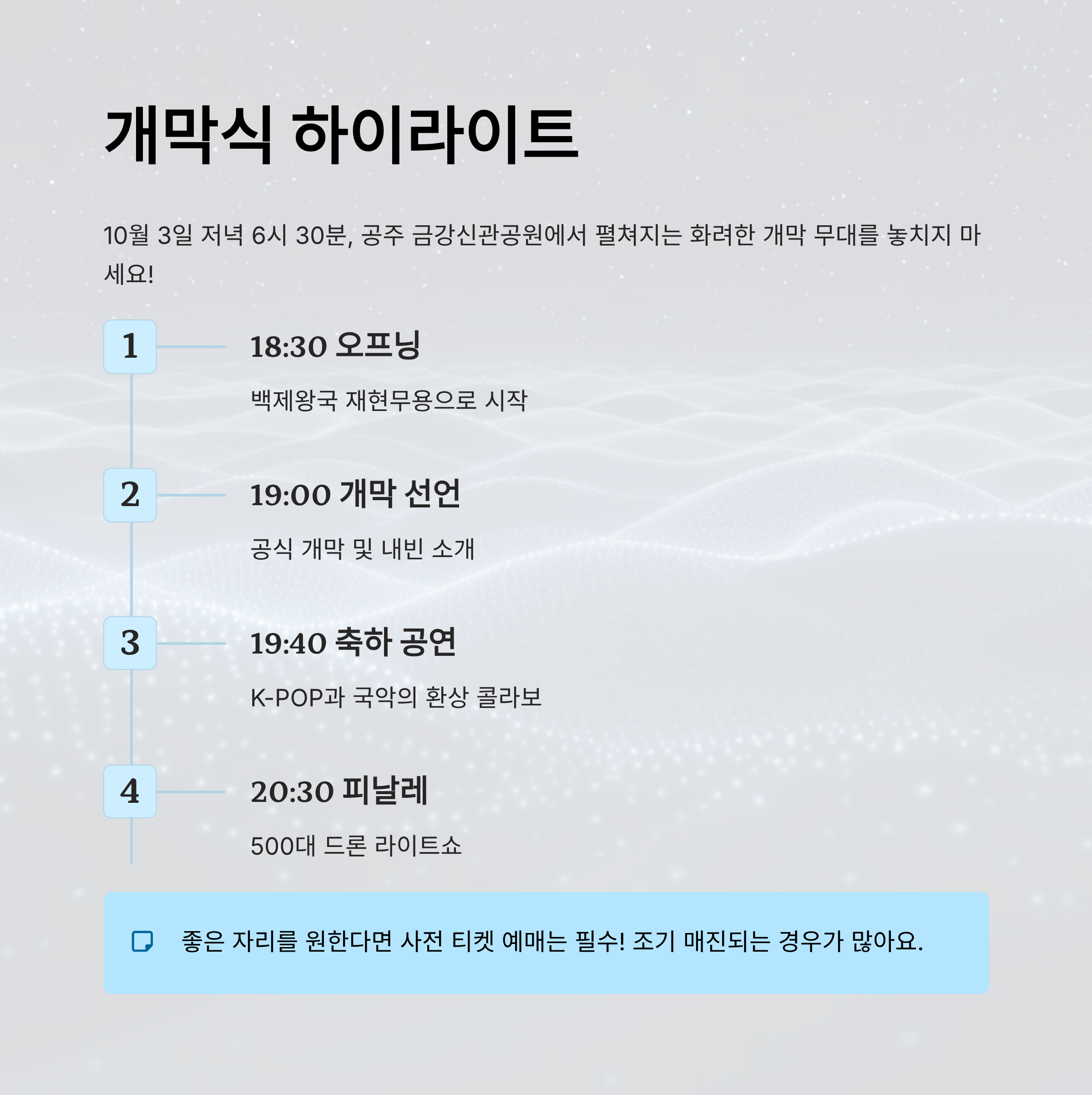 올해 개막식에서는 백제의 부흥을 테마로 한 미디어 아트 퍼포먼스와 멀티미디어 쇼, 그리고 국악과 현대무용이 결합된 융복합 공연이 펼쳐질 예정이에요. 시간대별 구성도 정말 알차게 짜여 있어서, 처음부터 끝까지 절대 놓치면 안 돼요.