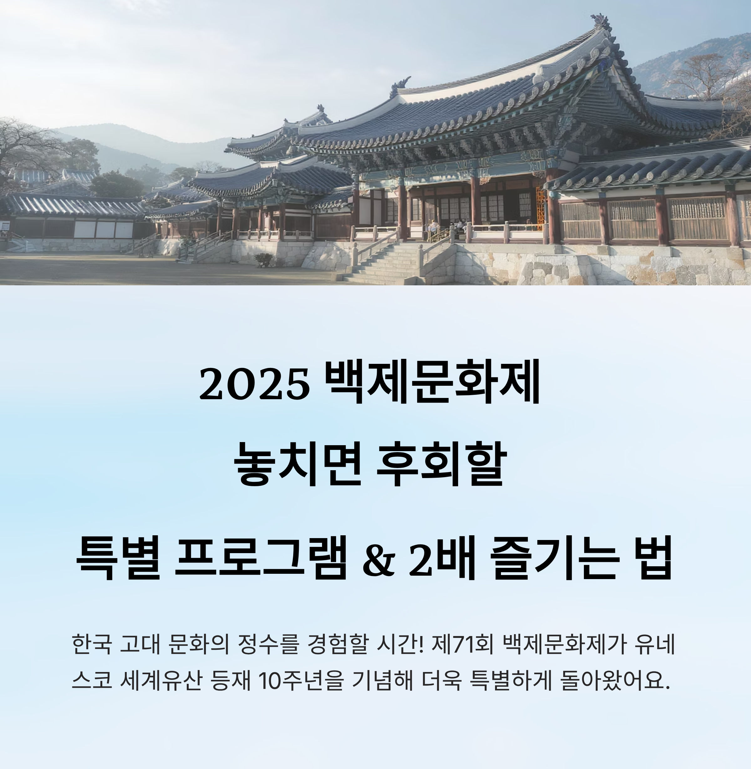 ✨ 한국의 찬란한 고대 문화를 직접 보고, 듣고, 즐길 수 있는 백제문화제가 어느덧 제71회를 맞이했어요! 올해는 특별히 유네스코 세계유산 등재 10주년을 기념해서 더욱 풍성한 프로그램이 준비되어 있다고 해요.