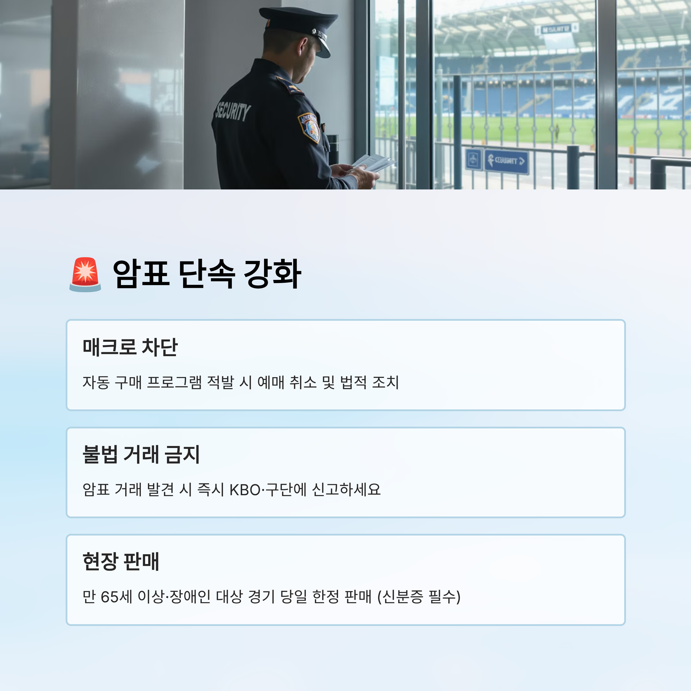 2025년 KBO 준플레이오프에서는 암표 거래와 매크로 사용을 근절하기 위해 강력한 단속이 이루어져요. KBO와 구단 측은 불법 예매 행위를 방지하기 위해 온라인과 현장에서 모두 집중적인 감시를 진행해요. 💂♀️