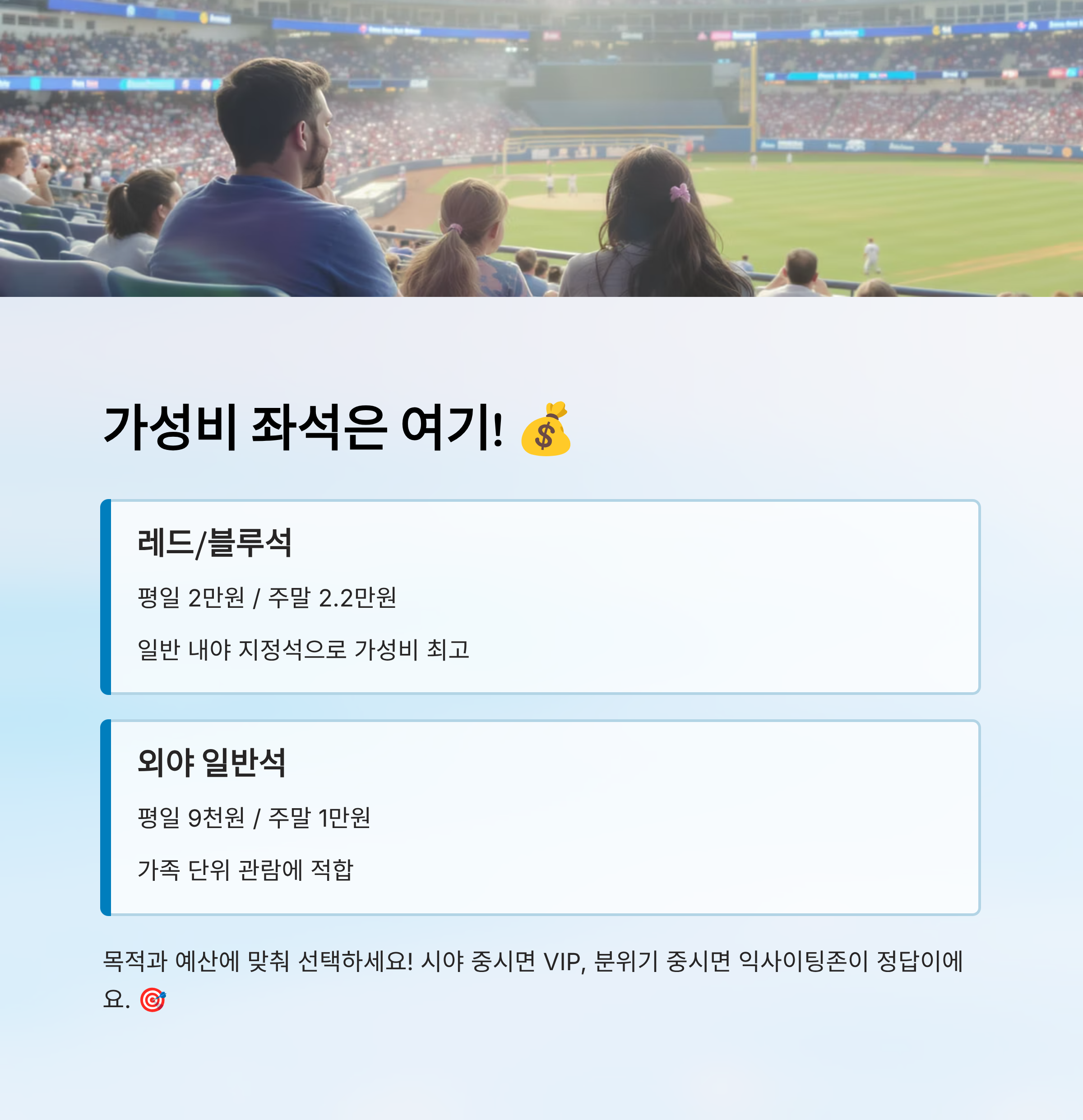 가성비를 따진다면 레드석이나 블루석 같은 일반 내야지정석이 좋고, 가족과 함께 조용히 야구를 즐기고 싶다면 외야 일반석도 나쁘지 않아요. 특히 외야석은 가격이 저렴해서 부담 없이 즐길 수 있어요!