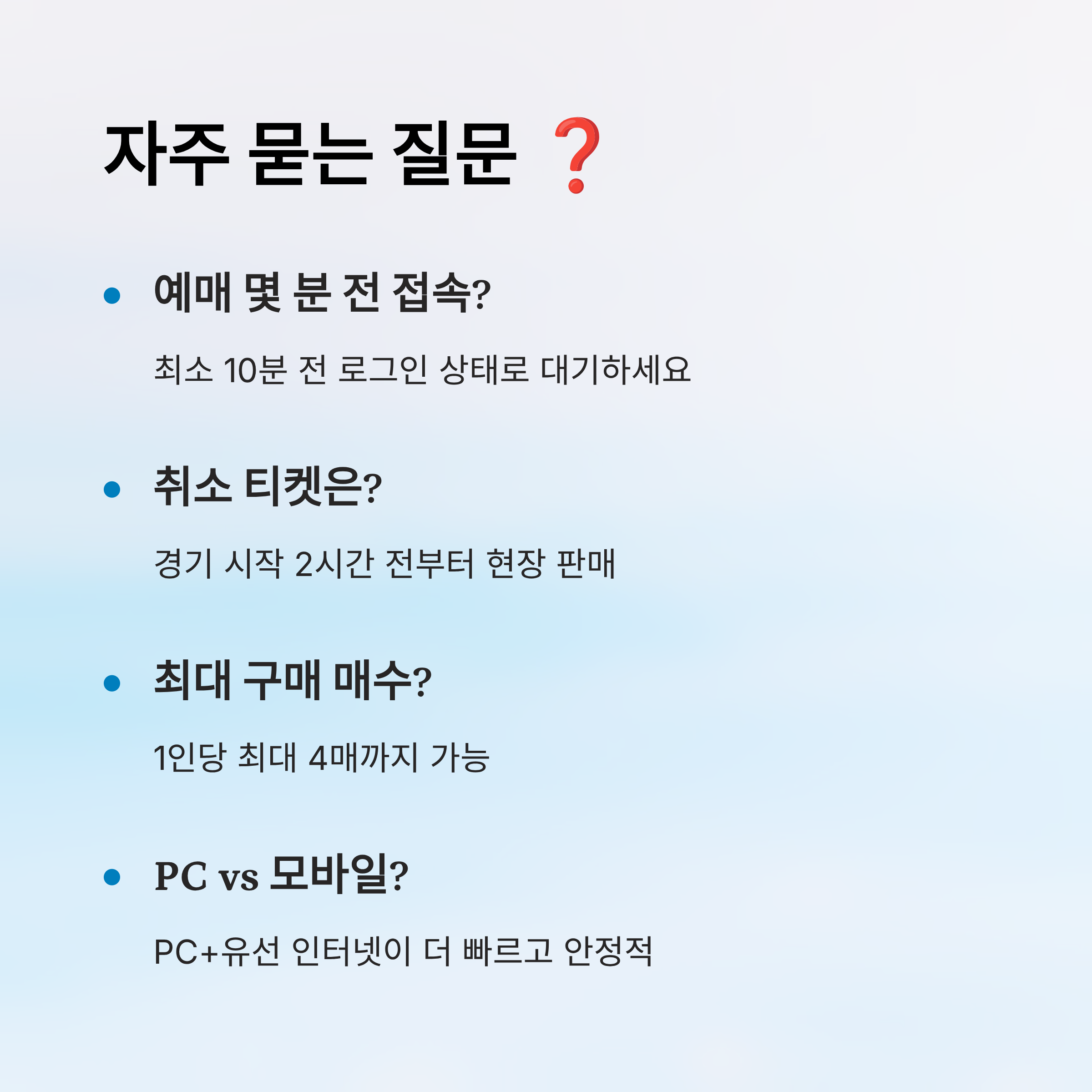 A2. 경기 시작 2시간 전부터 현장에서 예매 취소분 티켓이 판매될 수 있어요. 꼭 현장 확인 필요해요!