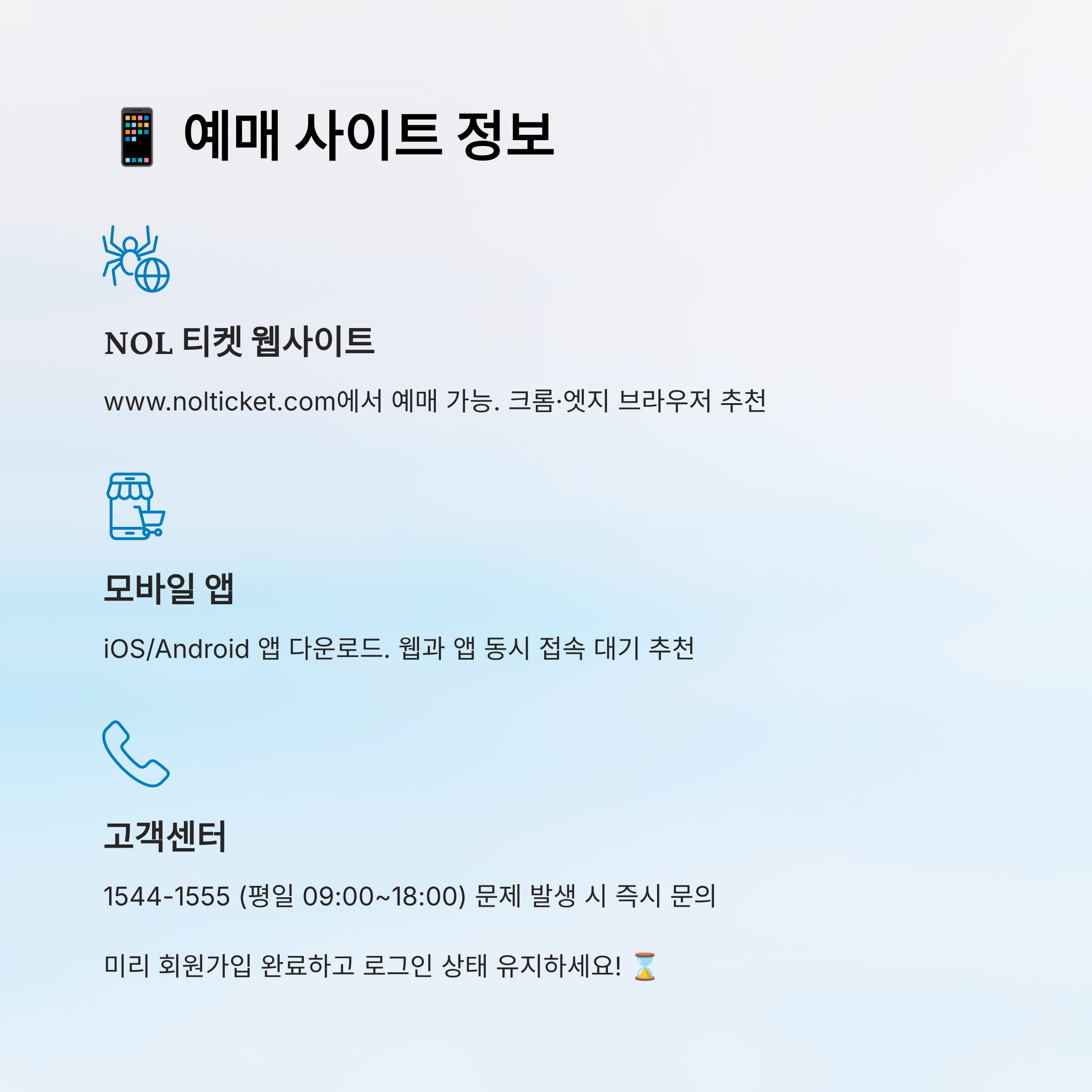 예매 시간에 맞춰 서버 접속이 폭주할 수 있기 때문에, 앱과 웹사이트 양쪽을 동시에 접속해 대기해두는 것이 좋아요. 브라우저는 크롬이나 엣지가 안정적으로 작동하는 편이에요!
