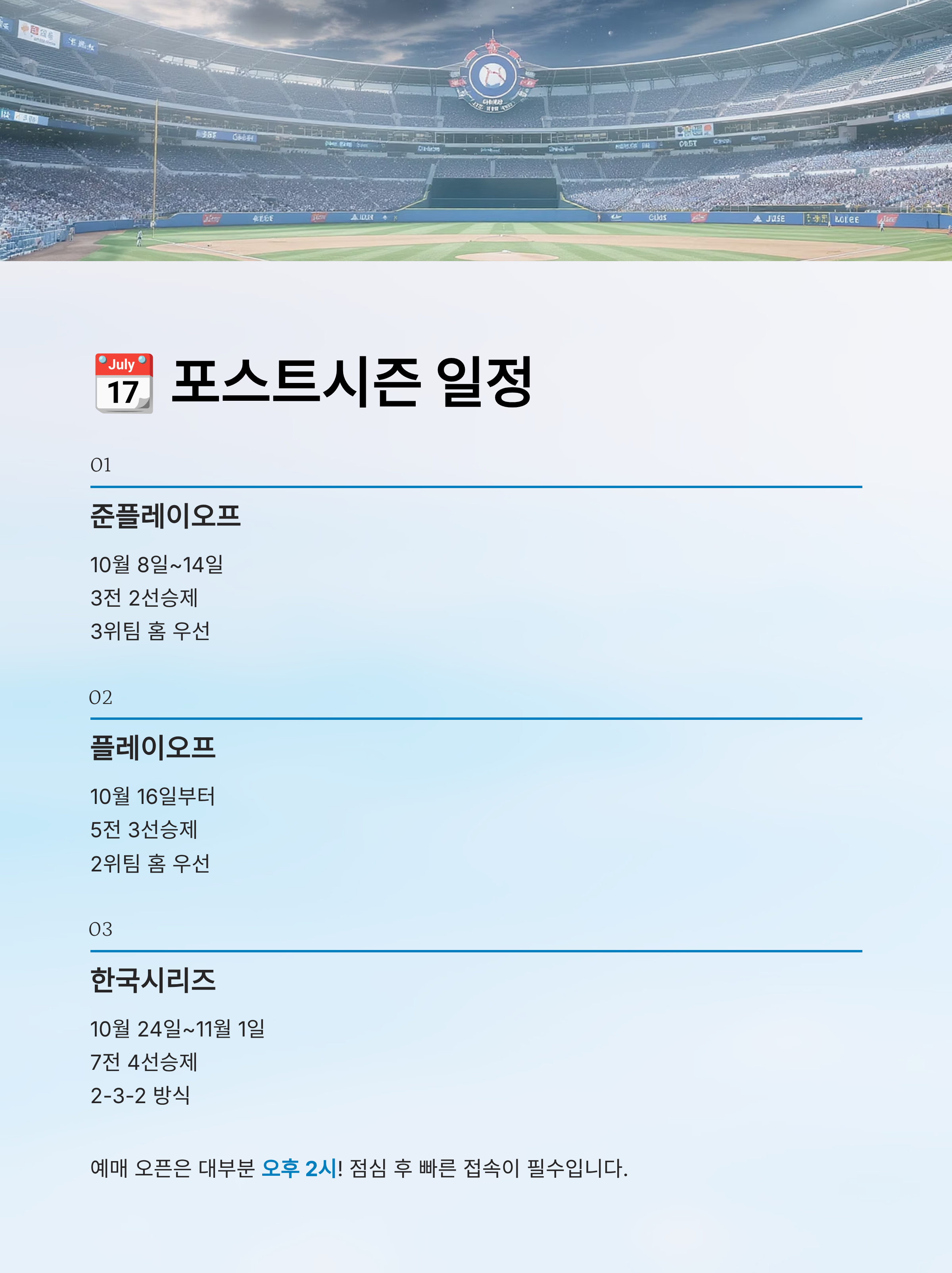 ⚠️ 본 글에 포함된 일정, 가격, 규정 등은 2025년 10월 기준이며, 구단 및 KBO 방침에 따라 사전 공지 없이 변경될 수 있어요. 정확한 정보는 각 구단 공식 홈페이지 및 KBO 공식 채널을 통해 확인해주세요.