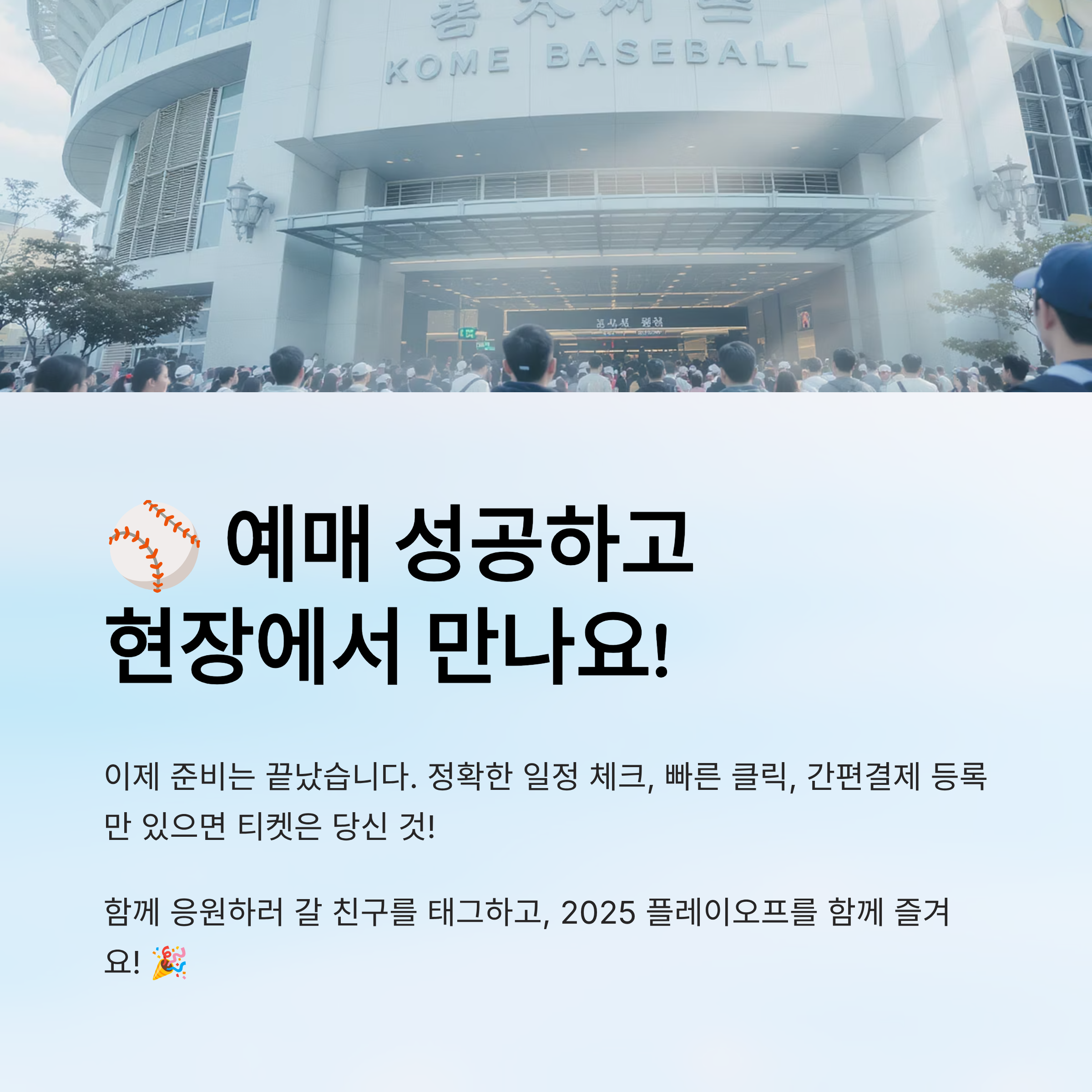 예매 완료 후에는 모바일 티켓 또는 출력용 PDF를 꼭 저장해두세요. 경기 당일 입장 시 이 티켓이 없으면 난감해질 수 있어요.