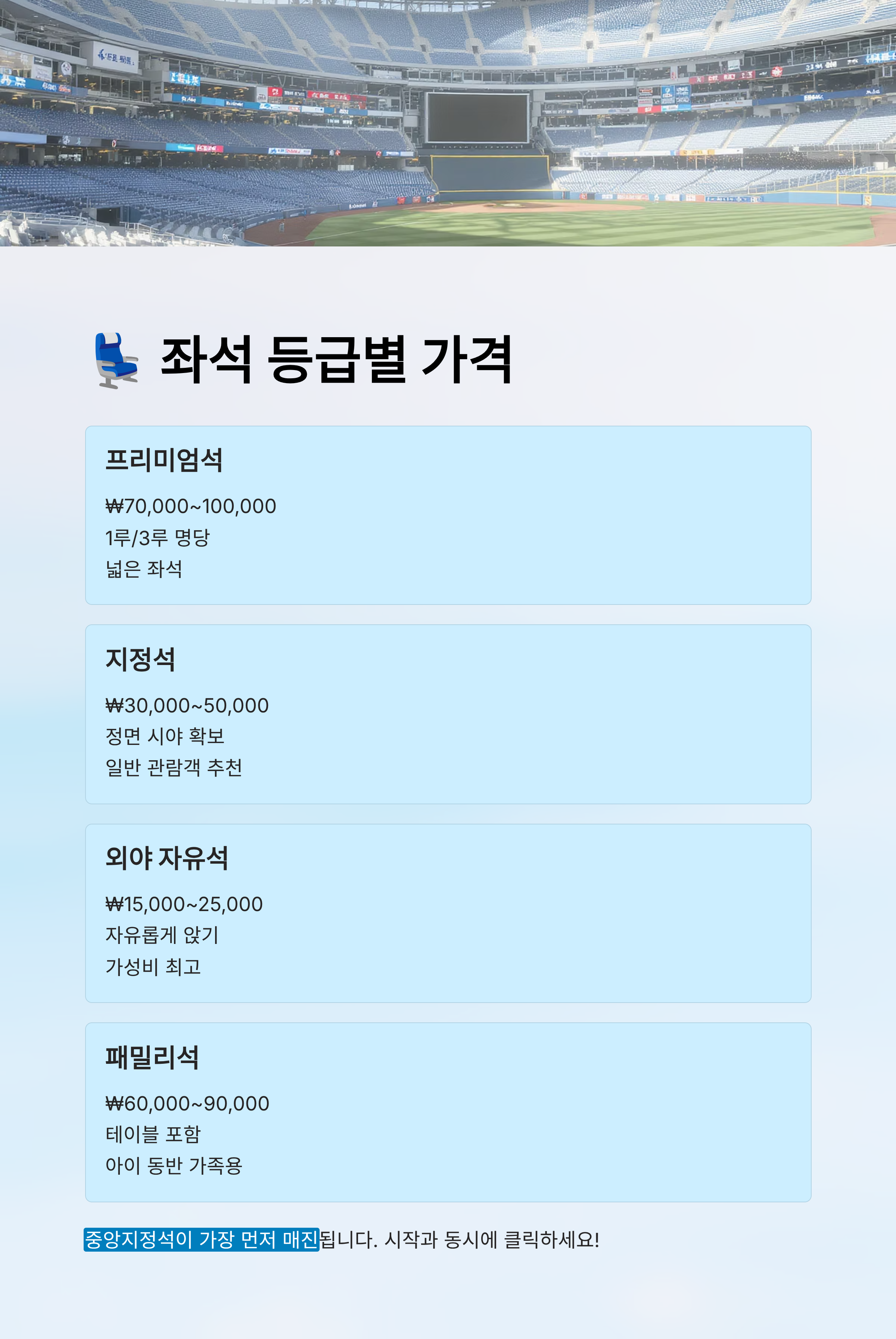| 프리미엄석 | ₩70,000~100,000 | 1루/3루 명당, 넓은 좌석 | 커플, VIP 관람객 |
