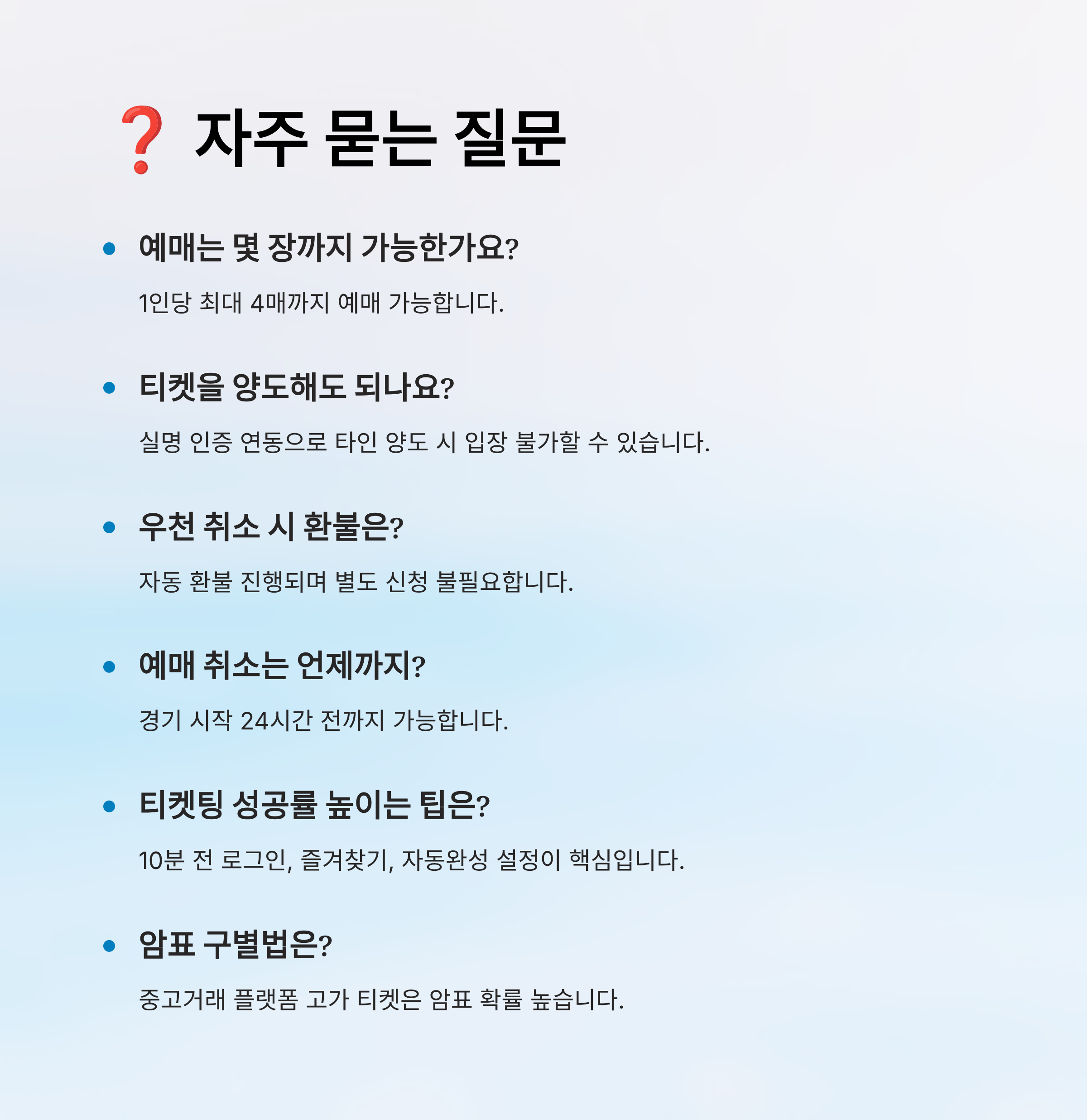 | 암표 단속 | 비공식 거래 적발 시 티켓 무효 처리 | 중고거래 플랫폼 이용 절대 금지 |